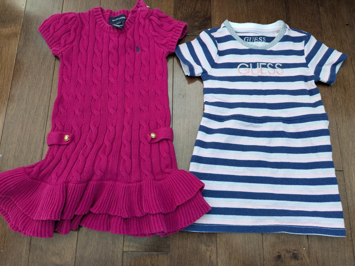 A pink cable-knit Ralph Lauren dress with ruffle details and a blue and white striped Guess dress. Both are size 2/2T. The Ralph Lauren dress is made of 100% cotton.