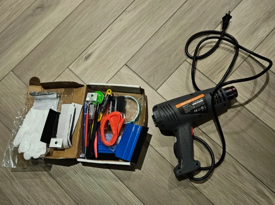 This is a heat gun tool kit. It includes a heat gun, gloves, a squeegee, and other vinyl wrap application tools. It's great for car wraps and other DIY projects.