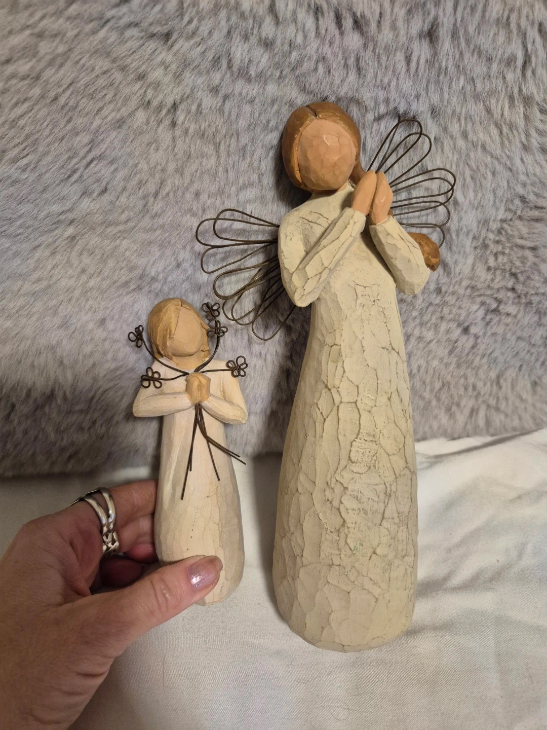 Two hand-painted Willow Tree angel figurines. The larger angel has wire wings and holds her hands together, while the smaller one holds a bouquet of wire flowers. These pieces are carved and painted in a style that evokes emotion and represents sentiments. They are made from resin and are approximately 10 inches and 6 inches tall. $20 for both.