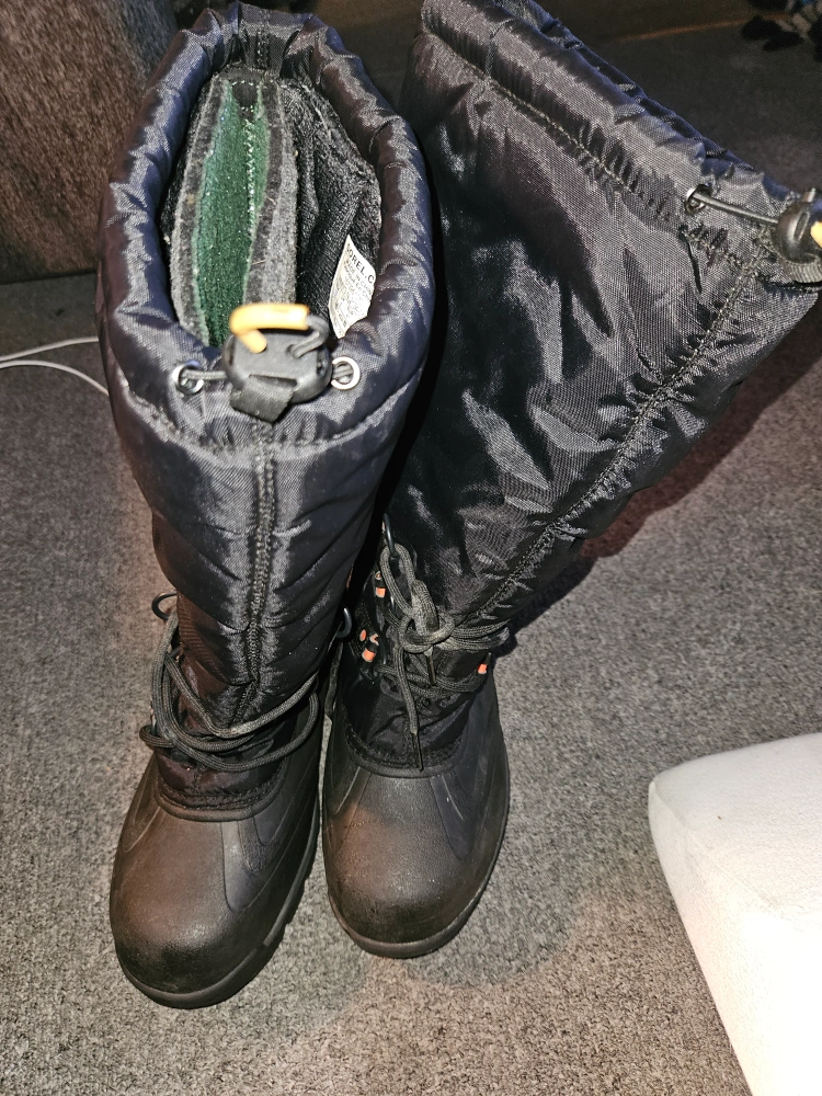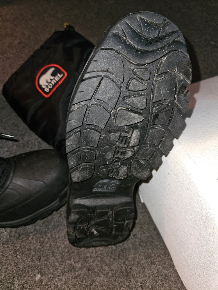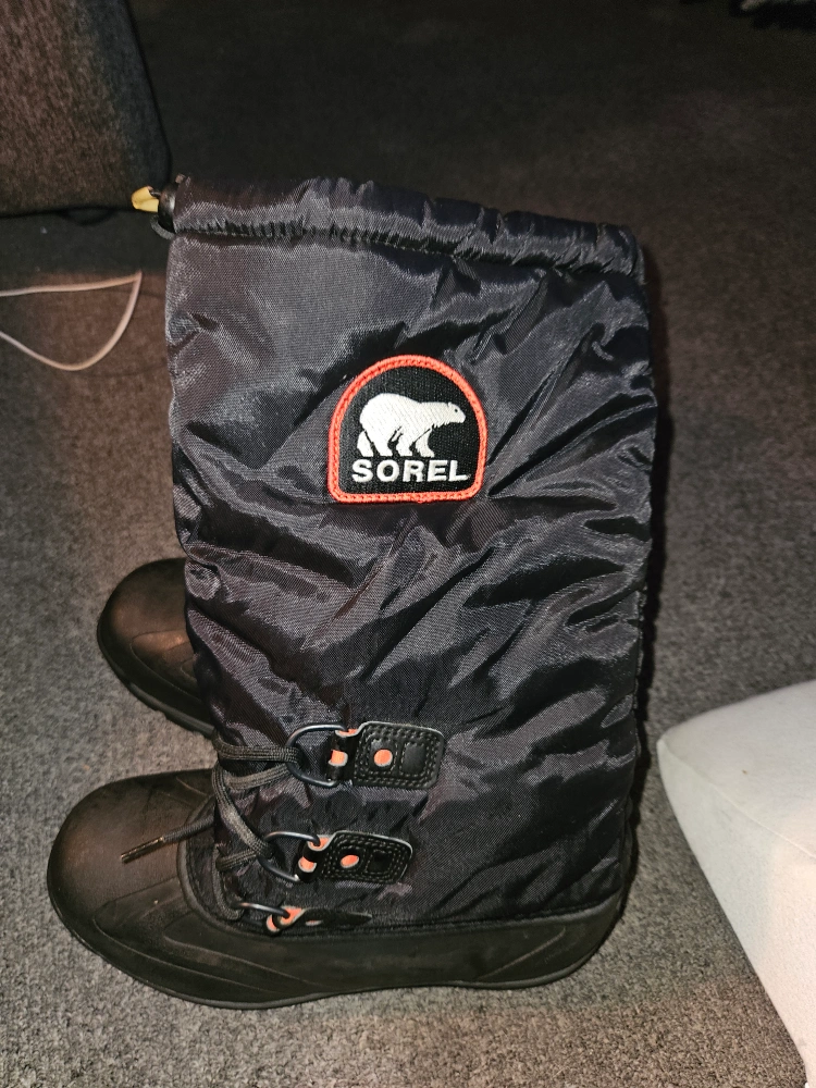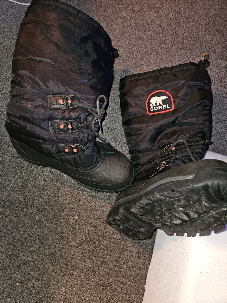 Pair of black Sorel winter boots. Tall, insulated, lace-up style. Good tread on soles. Includes storage bags. Only worn once. Super warm & isolated winter boots.