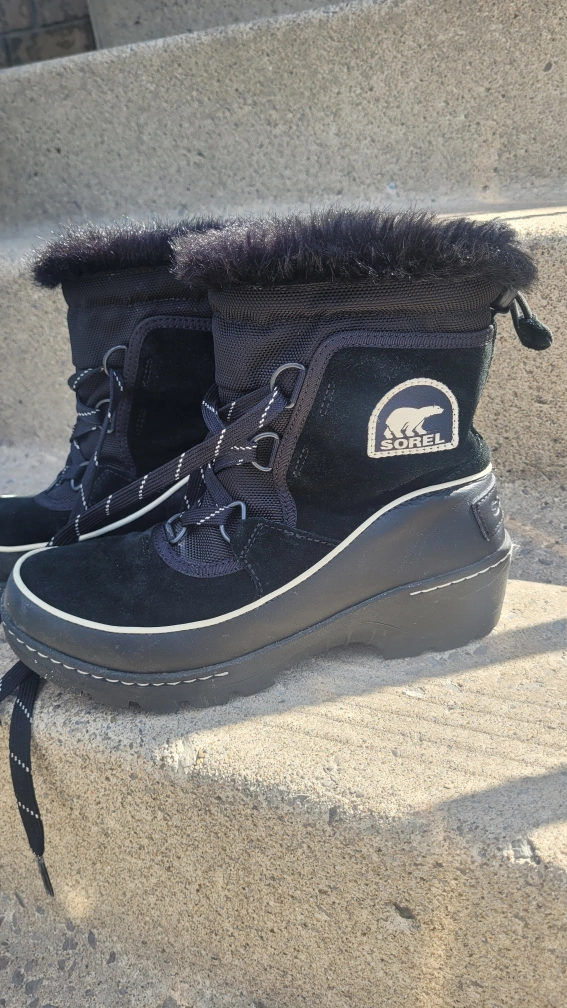 55Cozy Sorel winter boots in black! These are perfect for keeping your feet warm and dry during the cold Canadian months. They feature a faux fur trim and lace-up closure. GUC