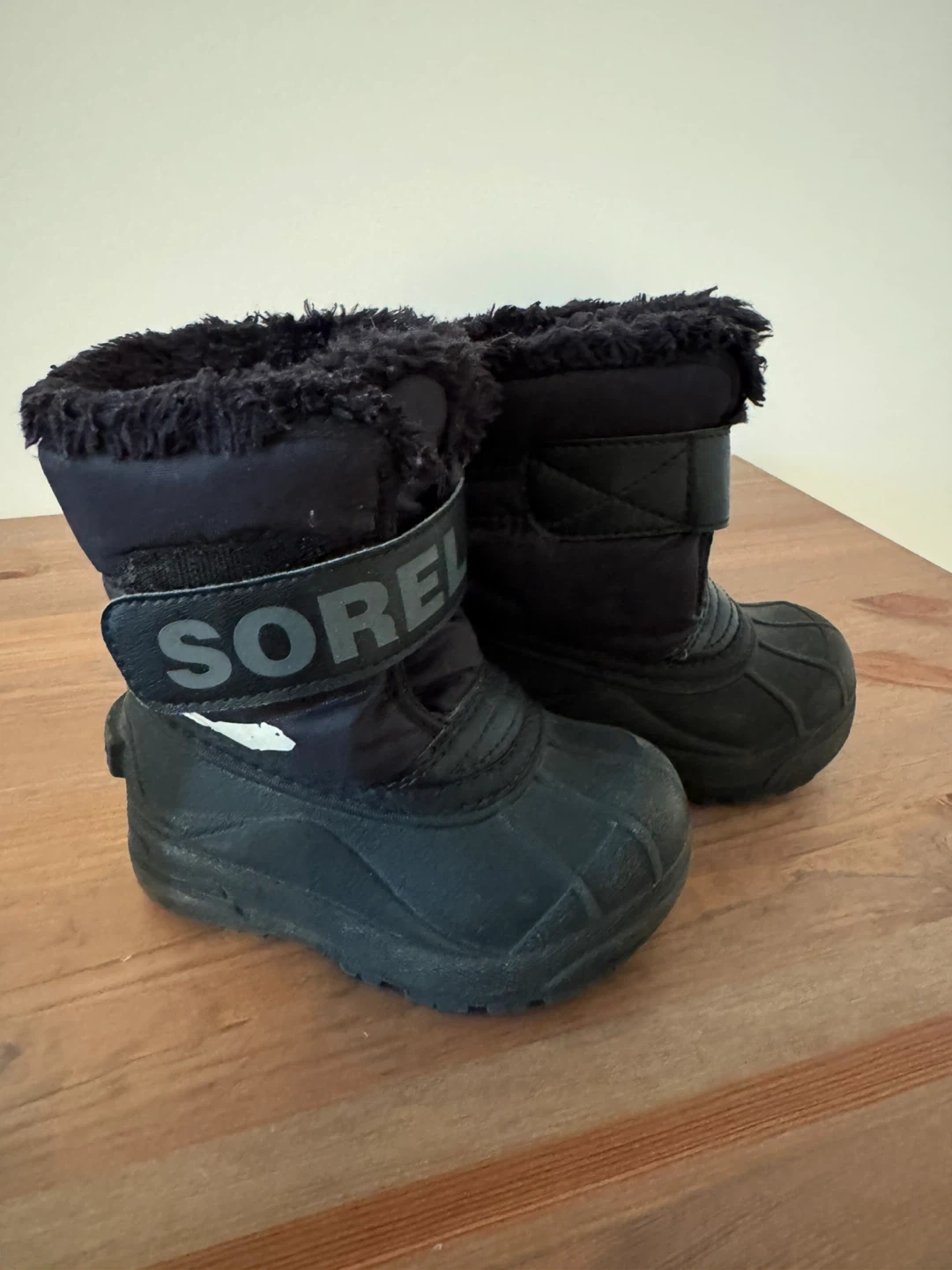 10These are a pair of Sorel winter boots in black. Perfect for keeping little feet warm and dry during the winter months! Toddler size 7. Pick up Pickering - whites and Taunton