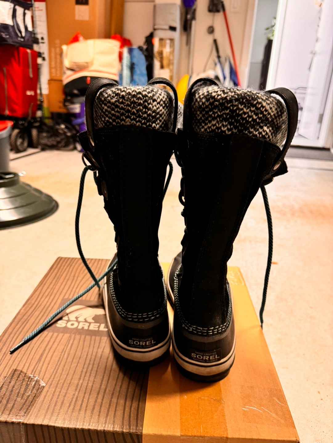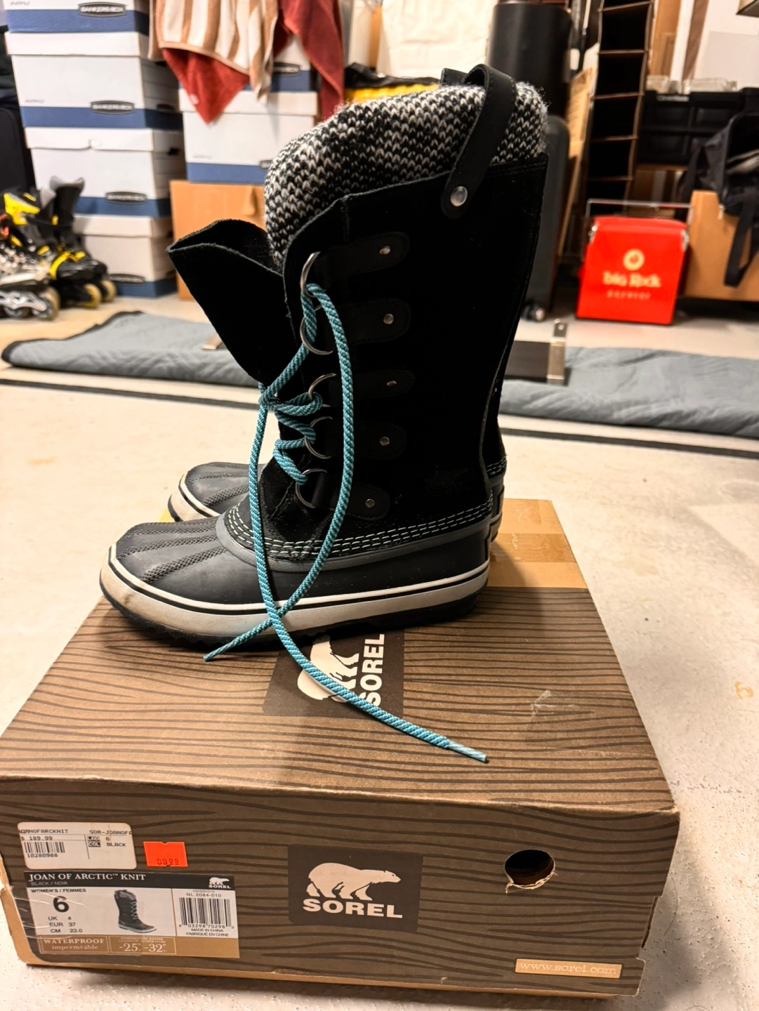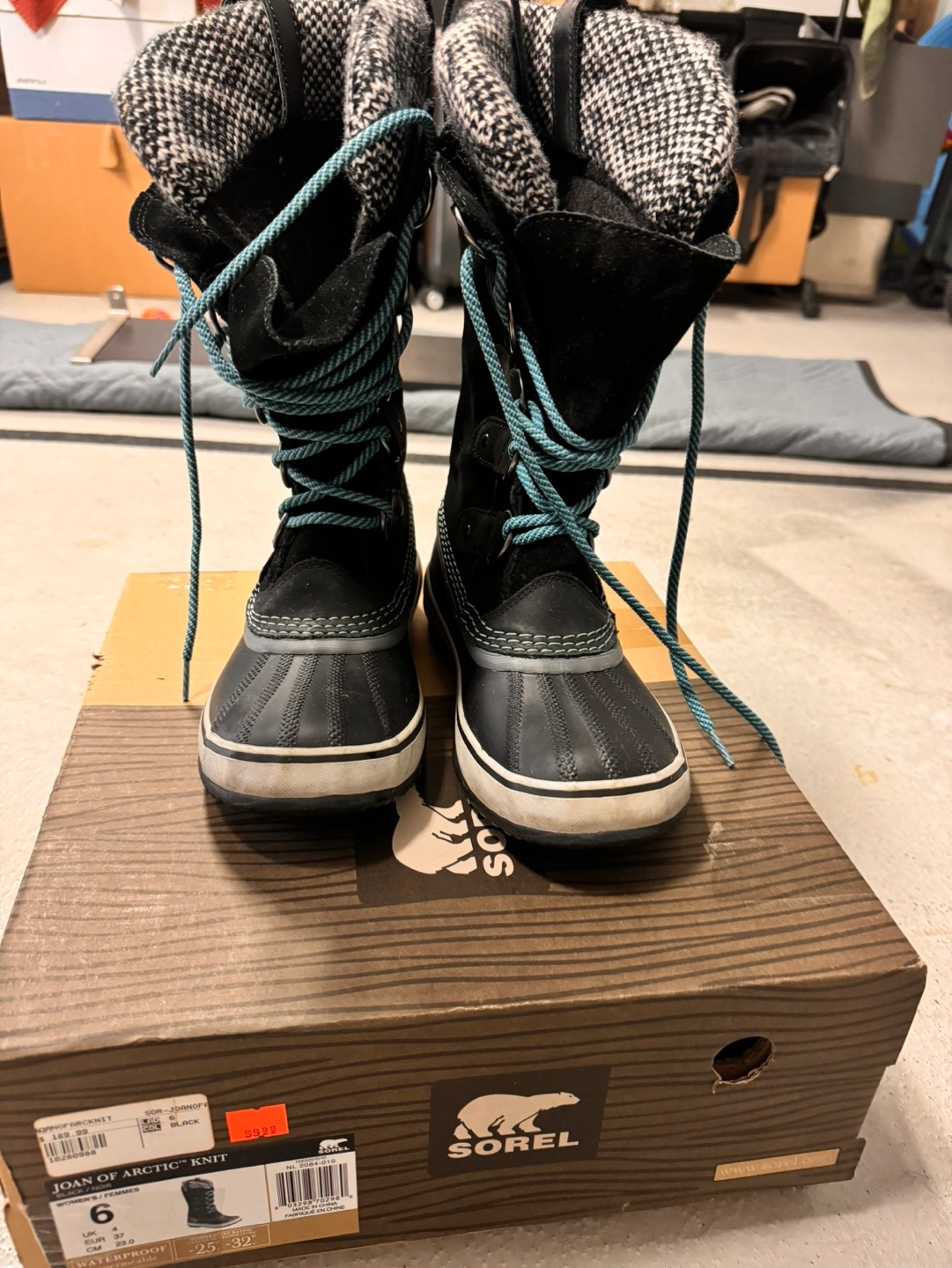 89Women's Sorel Joan of Arctic Knit winter boots. Size 6. Black suede and grey knit cuff. Teal laces. Waterproof. Great for snow and cold weather. Retail price 189.99