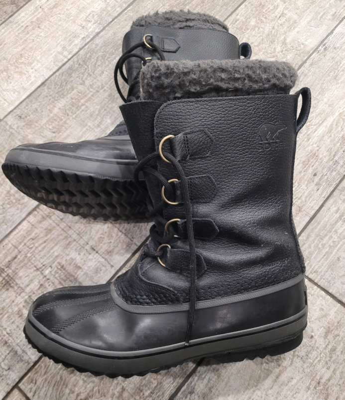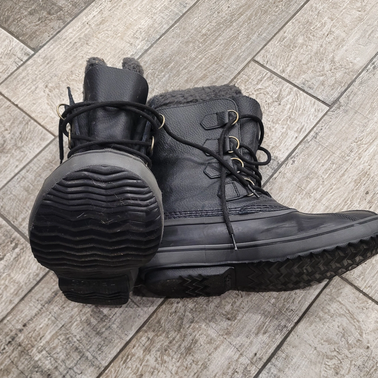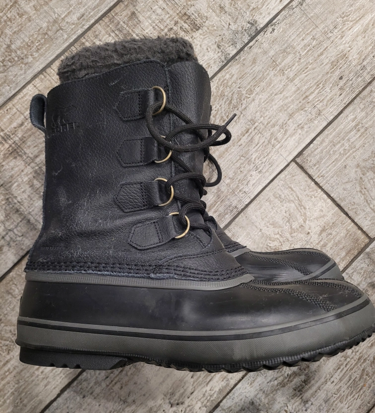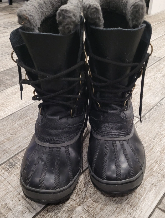 Men's black leather Sorel winter boots. Lace-up style. Warm fleece lining. Great for snow. Excellent condition.