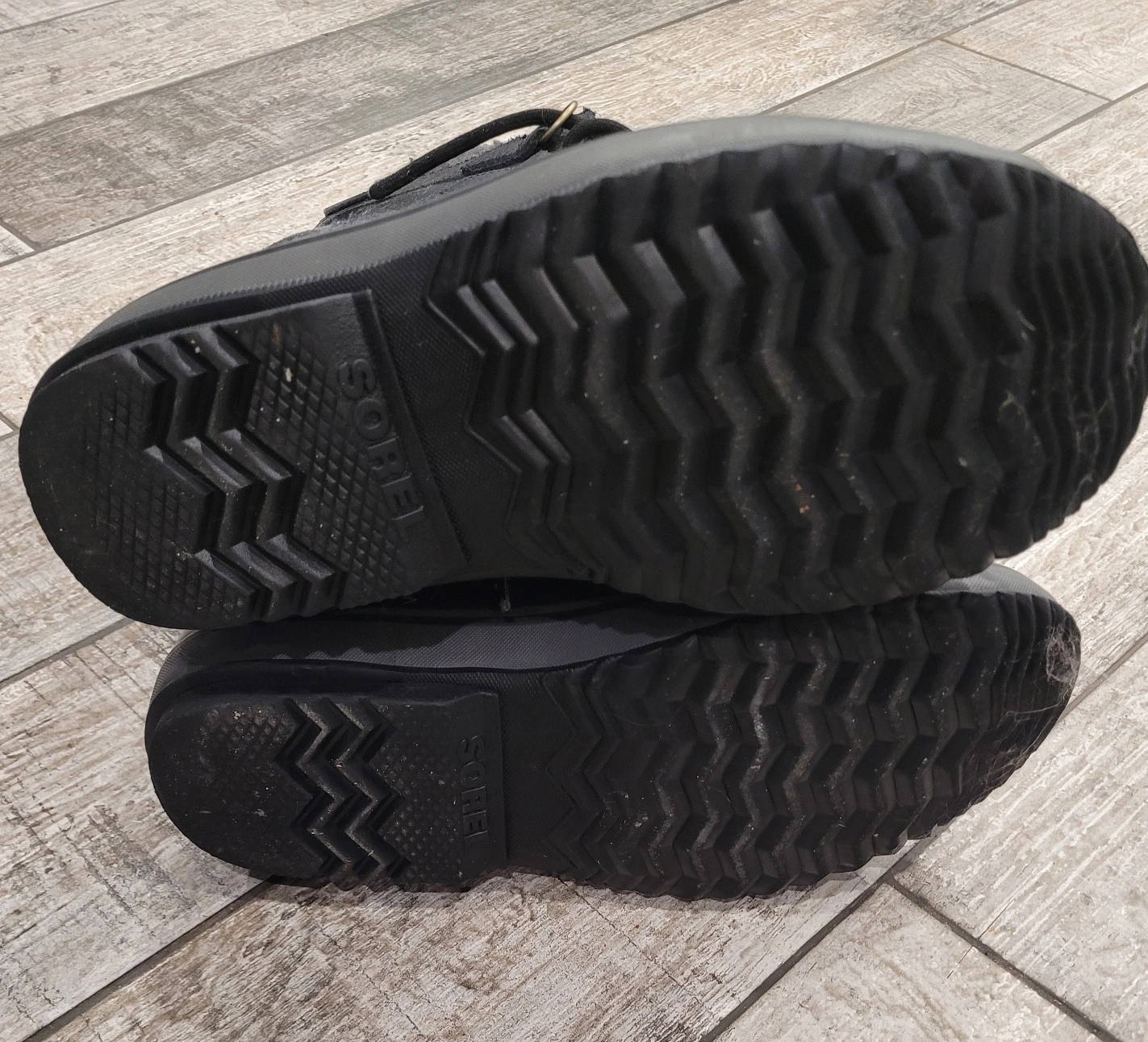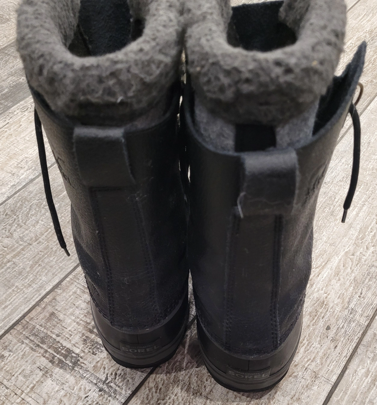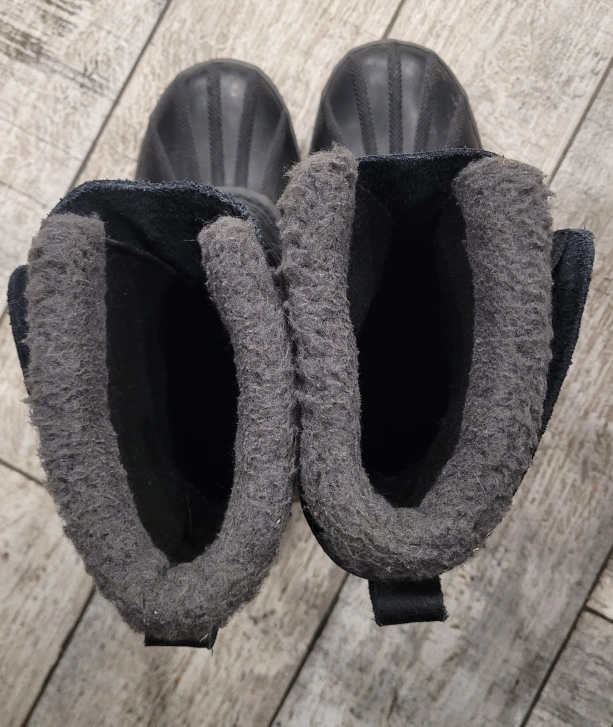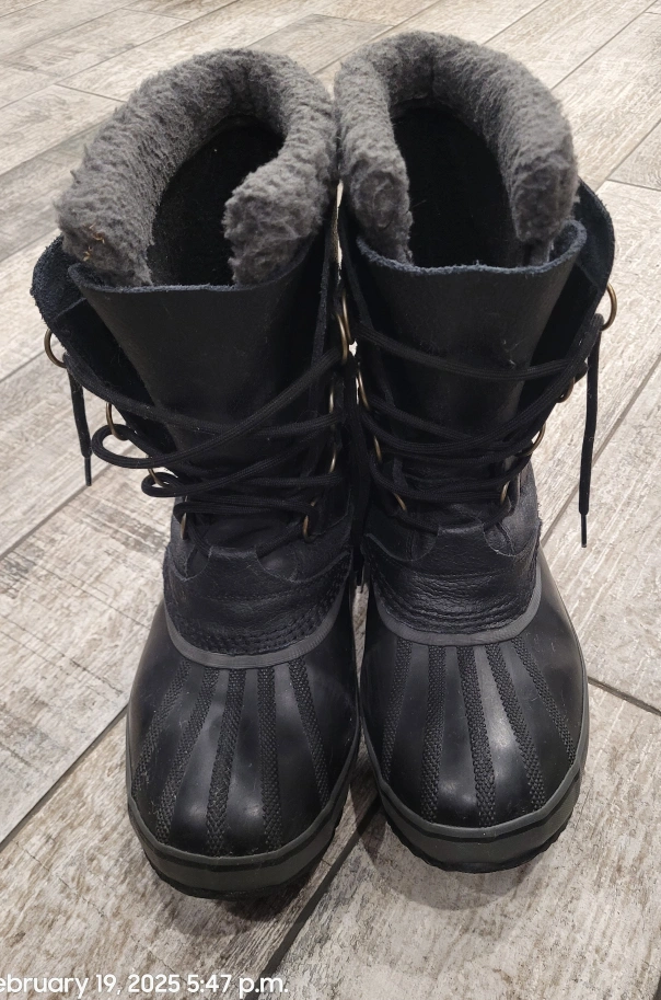 Men's black leather Sorel winter boots. Lace-up style. Warm fleece lining. Great for snow. Excellent condition.