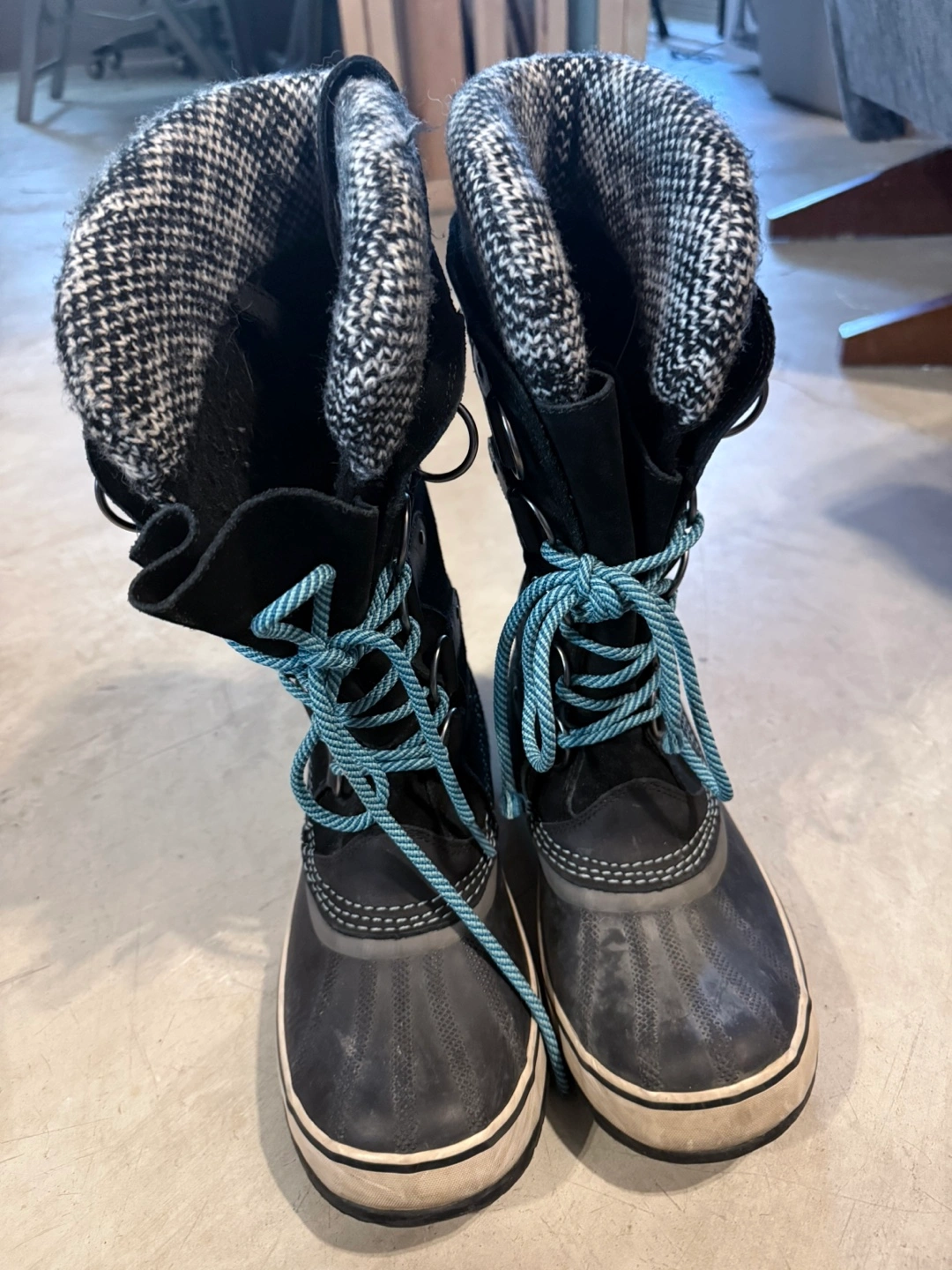 Here are some Sorel winter boots! They feature a black and grey colour scheme with blue laces. Perfect for keeping your feet warm and dry during the Canadian winter season