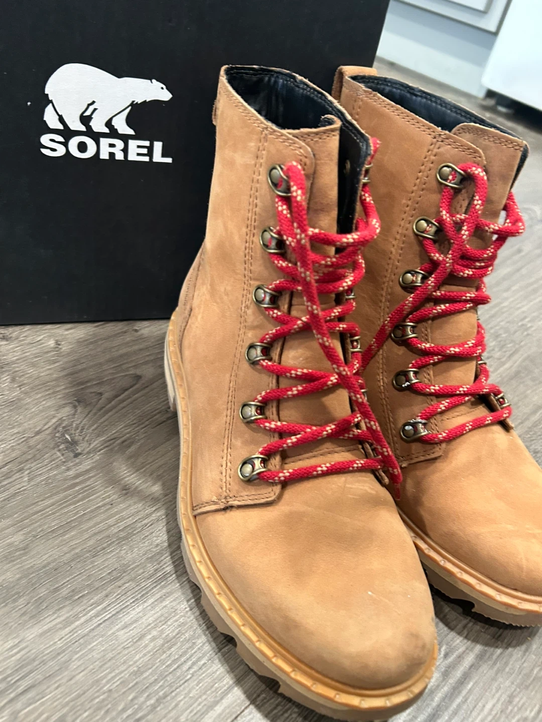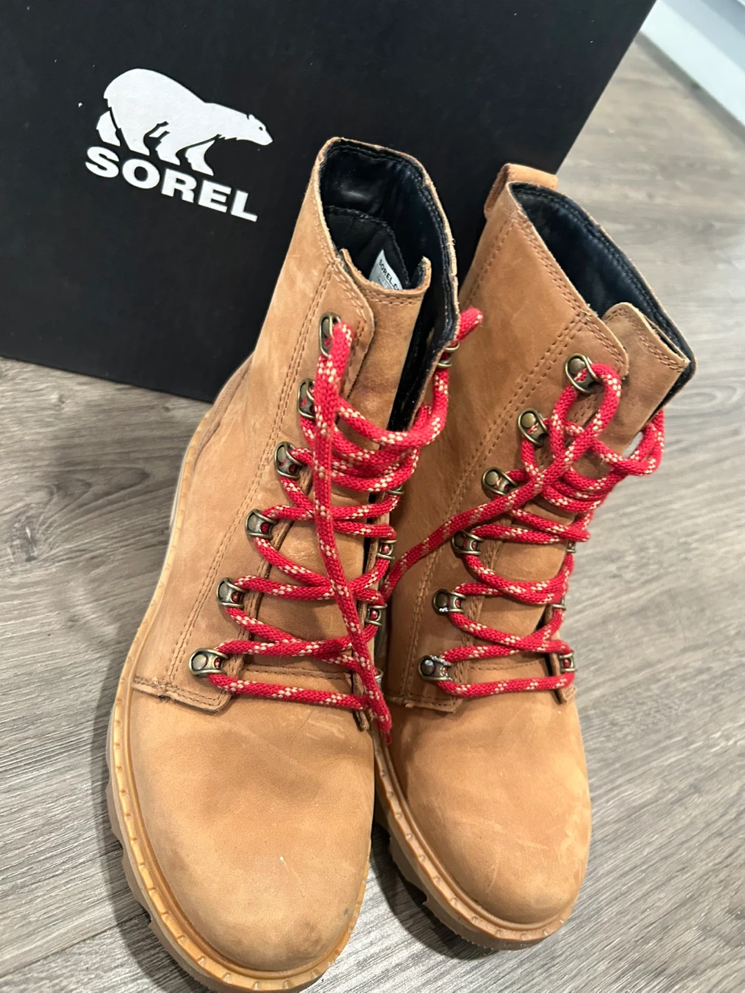 These Sorel Brex ankle boots are in great condition and come with the original box! They feature a stylish design with red and white laces, perfect for adding a pop of colour to your outfit. These boots are both fashionable and functional!