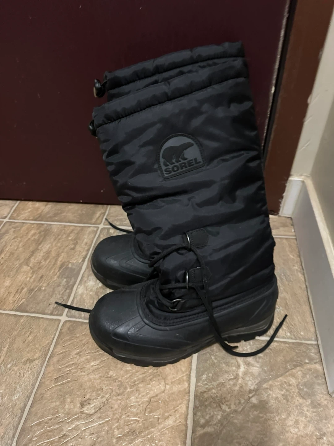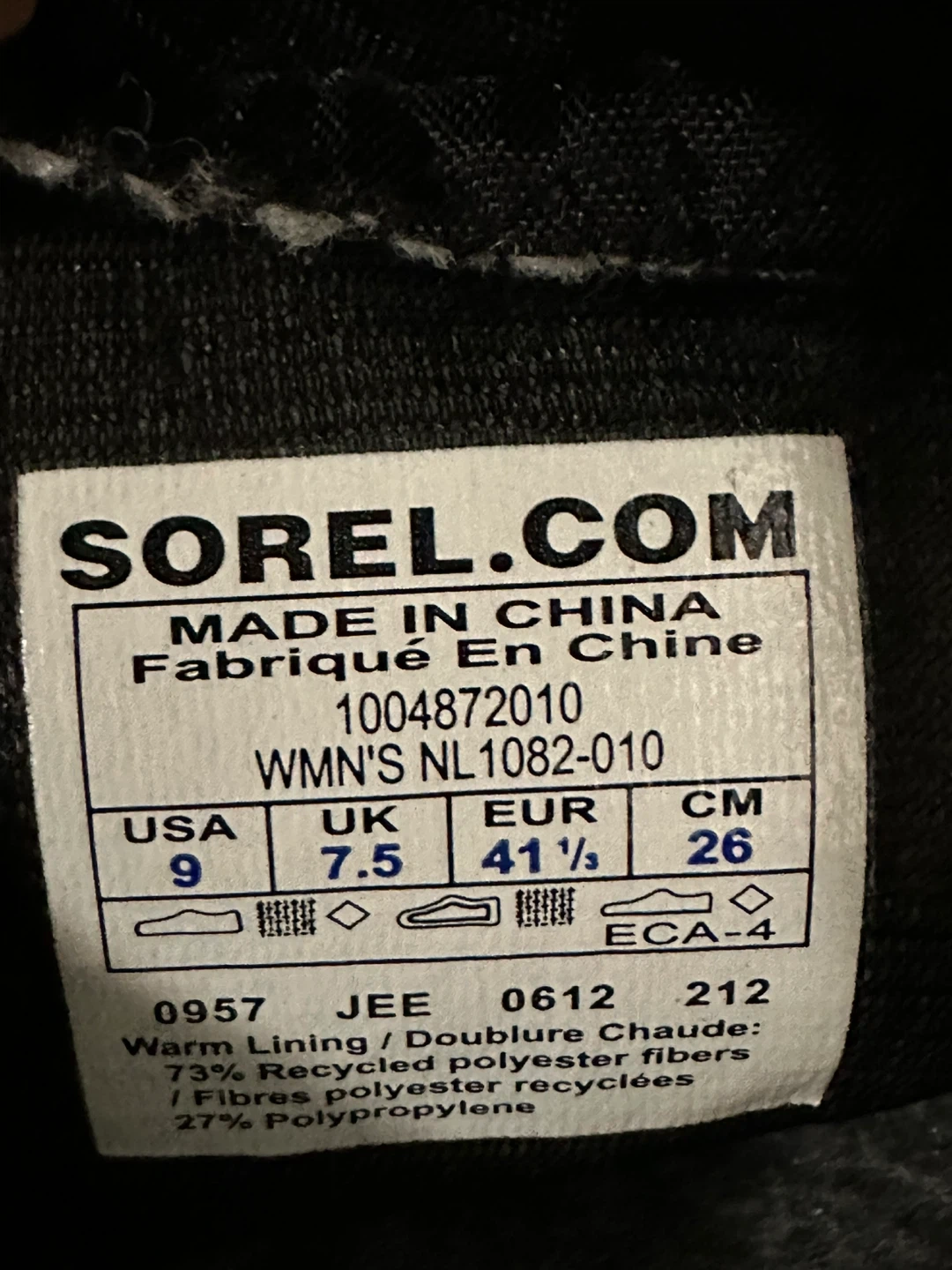 10Keep your feet warm this winter with these Sorel women's winter boots! They are a size 9. The boots are made with 73% recycled polyester fibres and 27% polypropylene for a warm lining.
