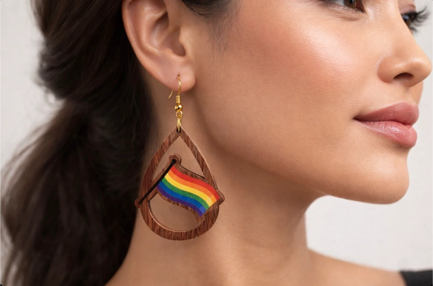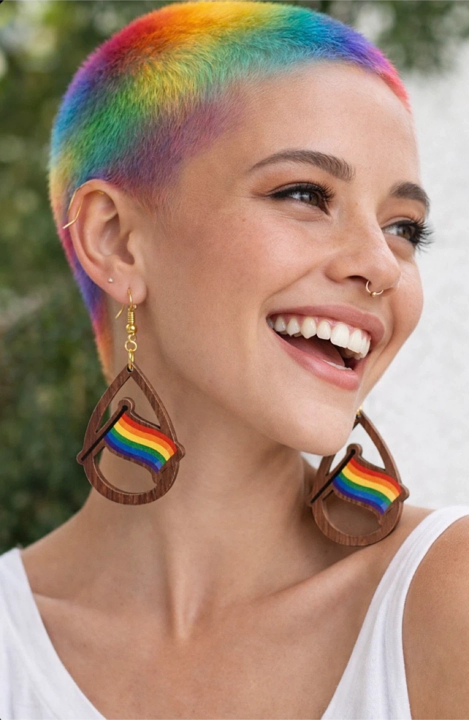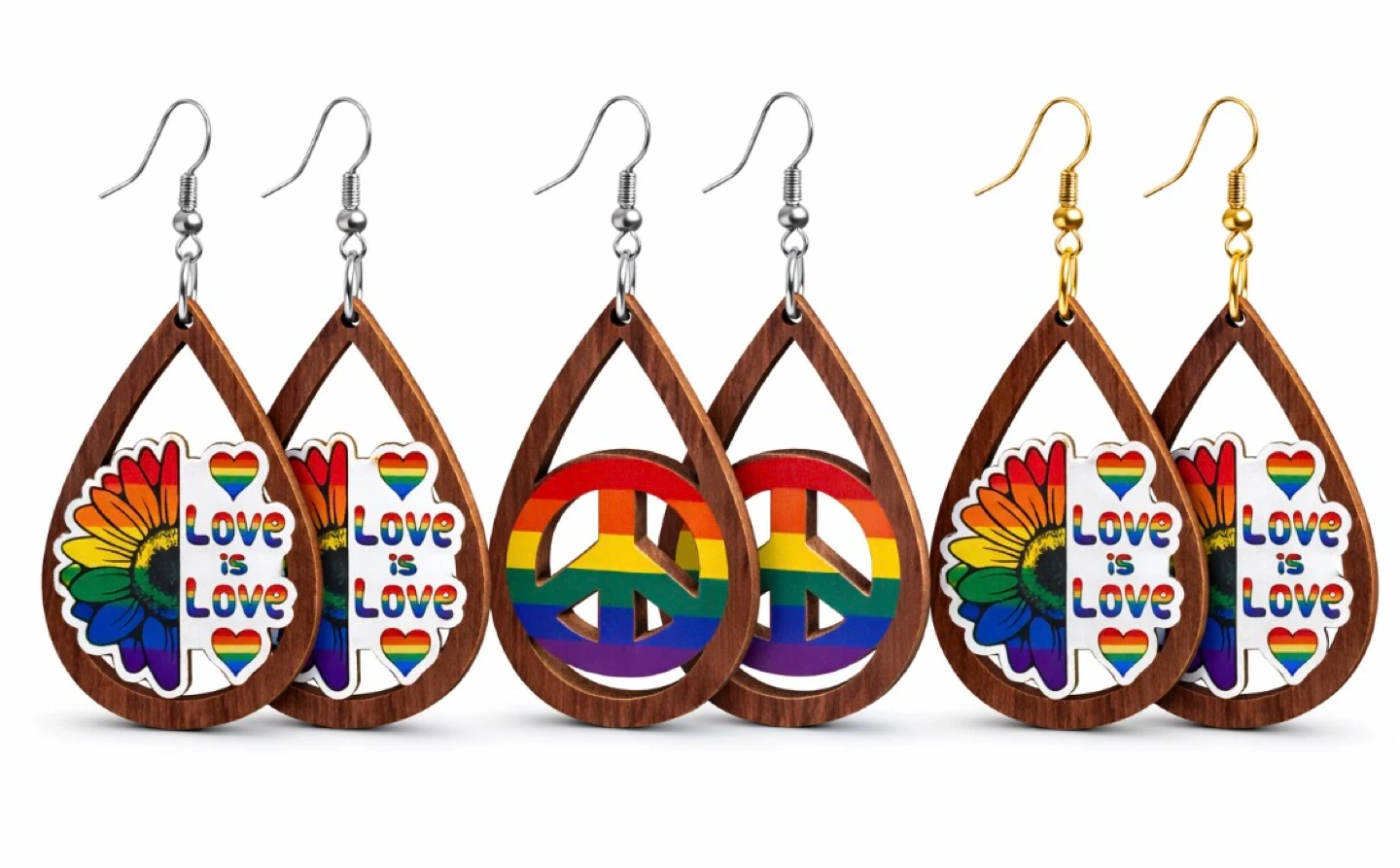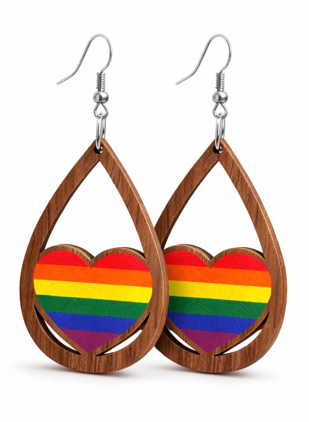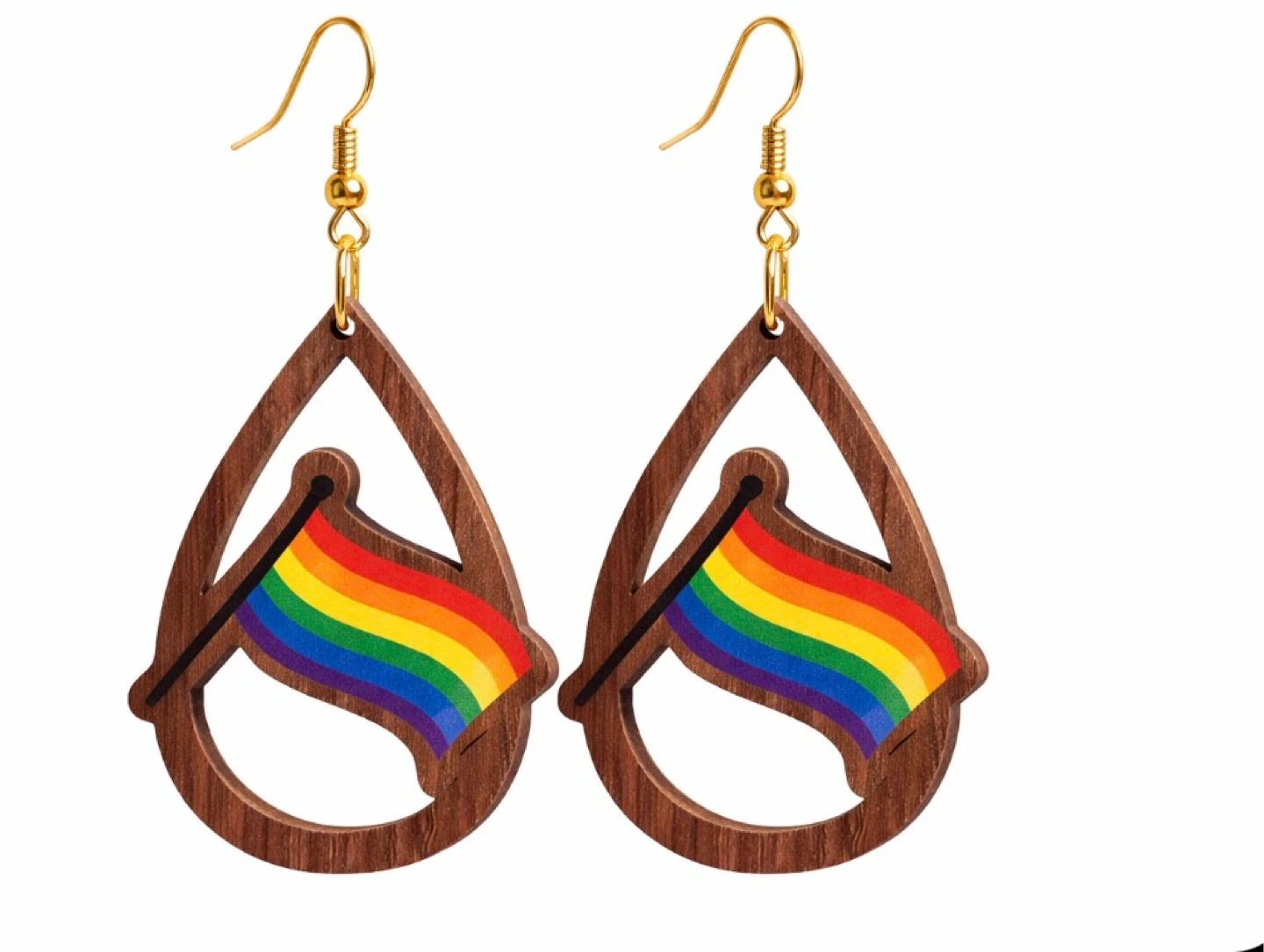 These teardrop earrings feature rainbow pride designs. They're made from wood with metal hooks. Show your pride with these fun accessories!