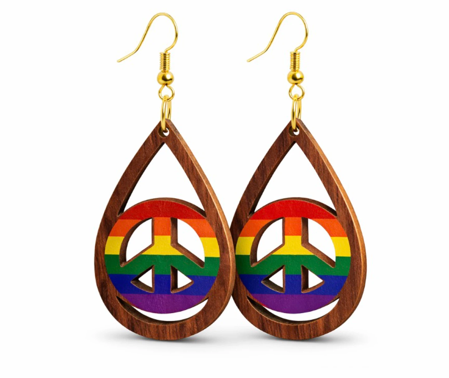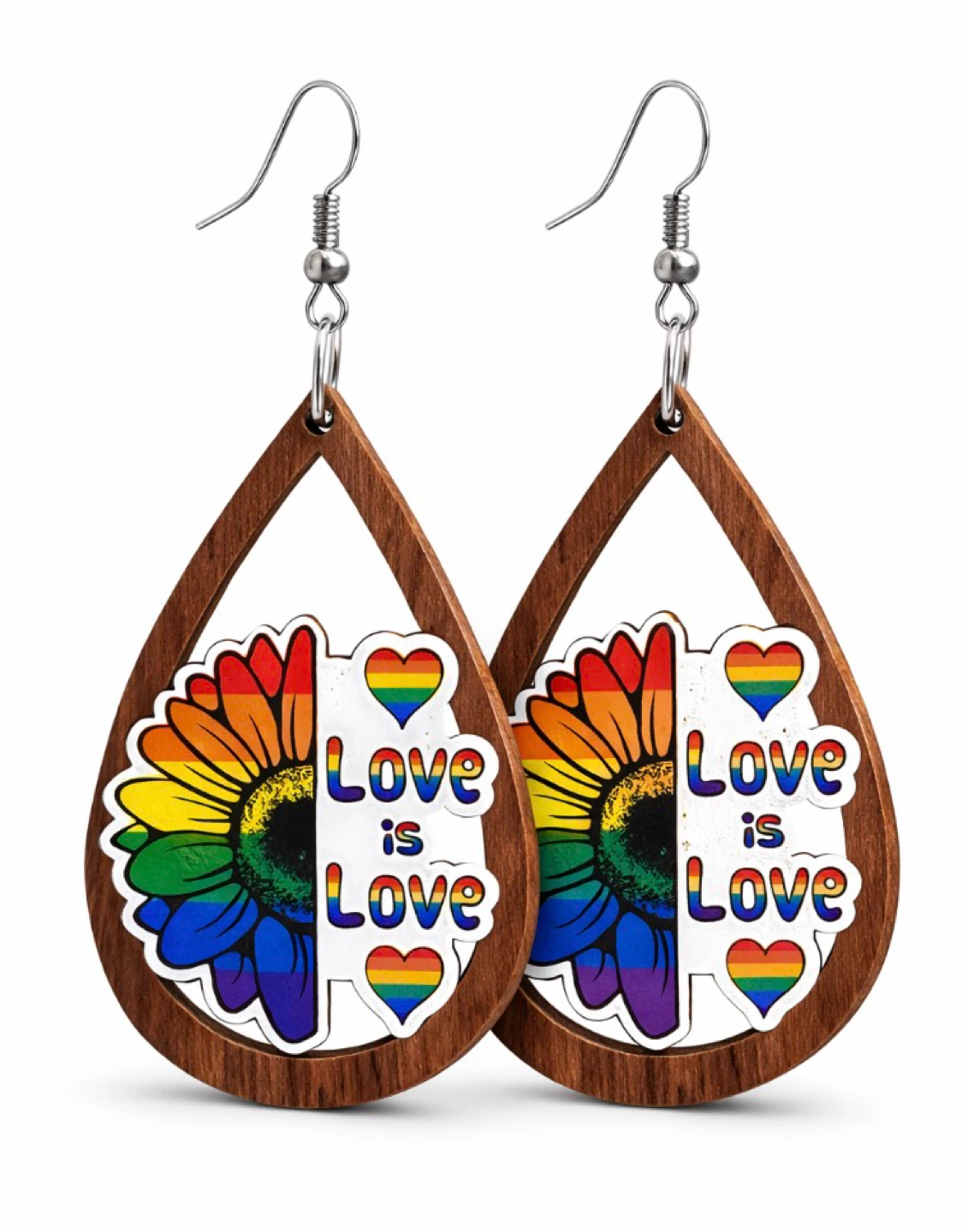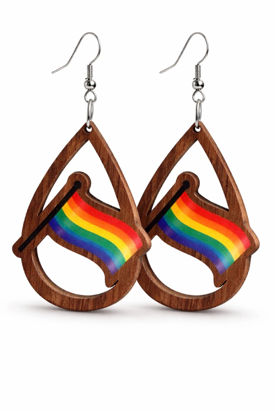 These teardrop earrings feature rainbow pride designs. They're made from wood with metal hooks. Show your pride with these fun accessories!