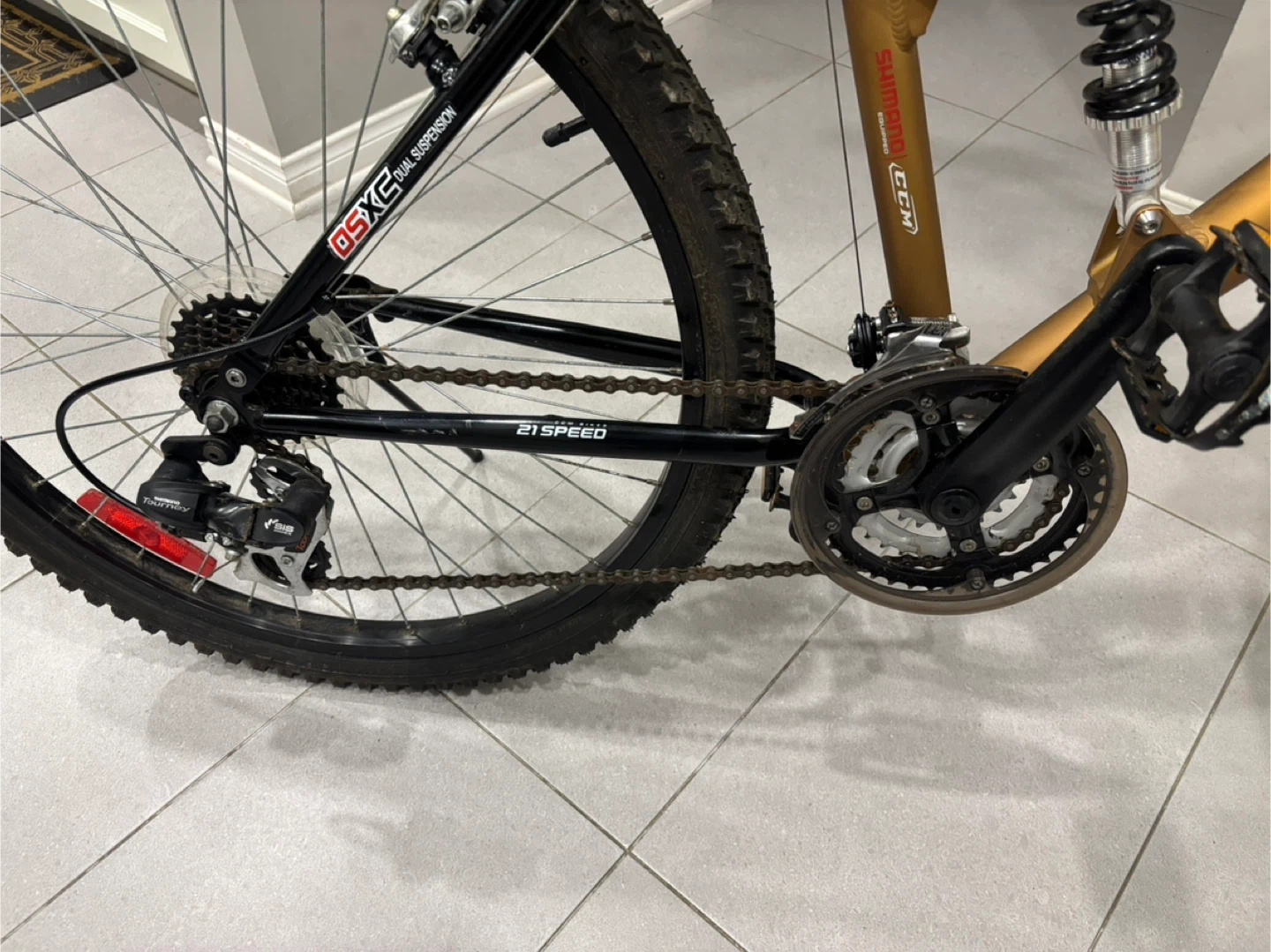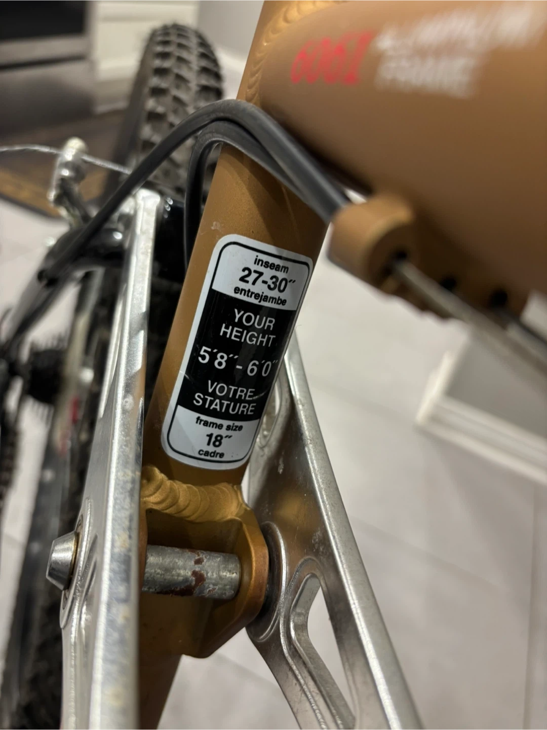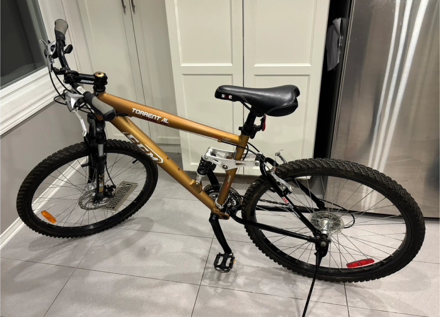 This CCM Torrent AL mountain bike features a gold aluminum frame and 21 speeds. It's a dual suspension bike with disc brakes. Recommended for riders 5'8" to 6'0".