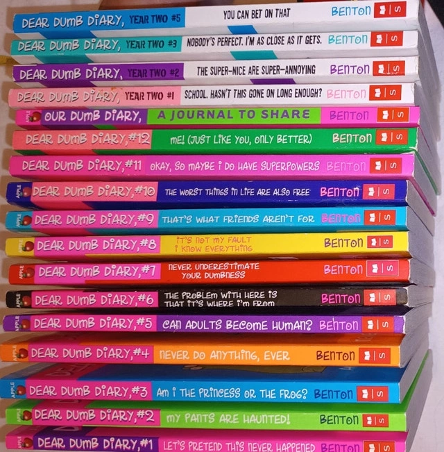 Selling a collection of Dear Dumb Diary books, including books 1-12, plus the Journal "Year Two" (volumes 1-3, 5). All books are in used, like-new condition. From a smoke-free home. Message to arrange pickup only.