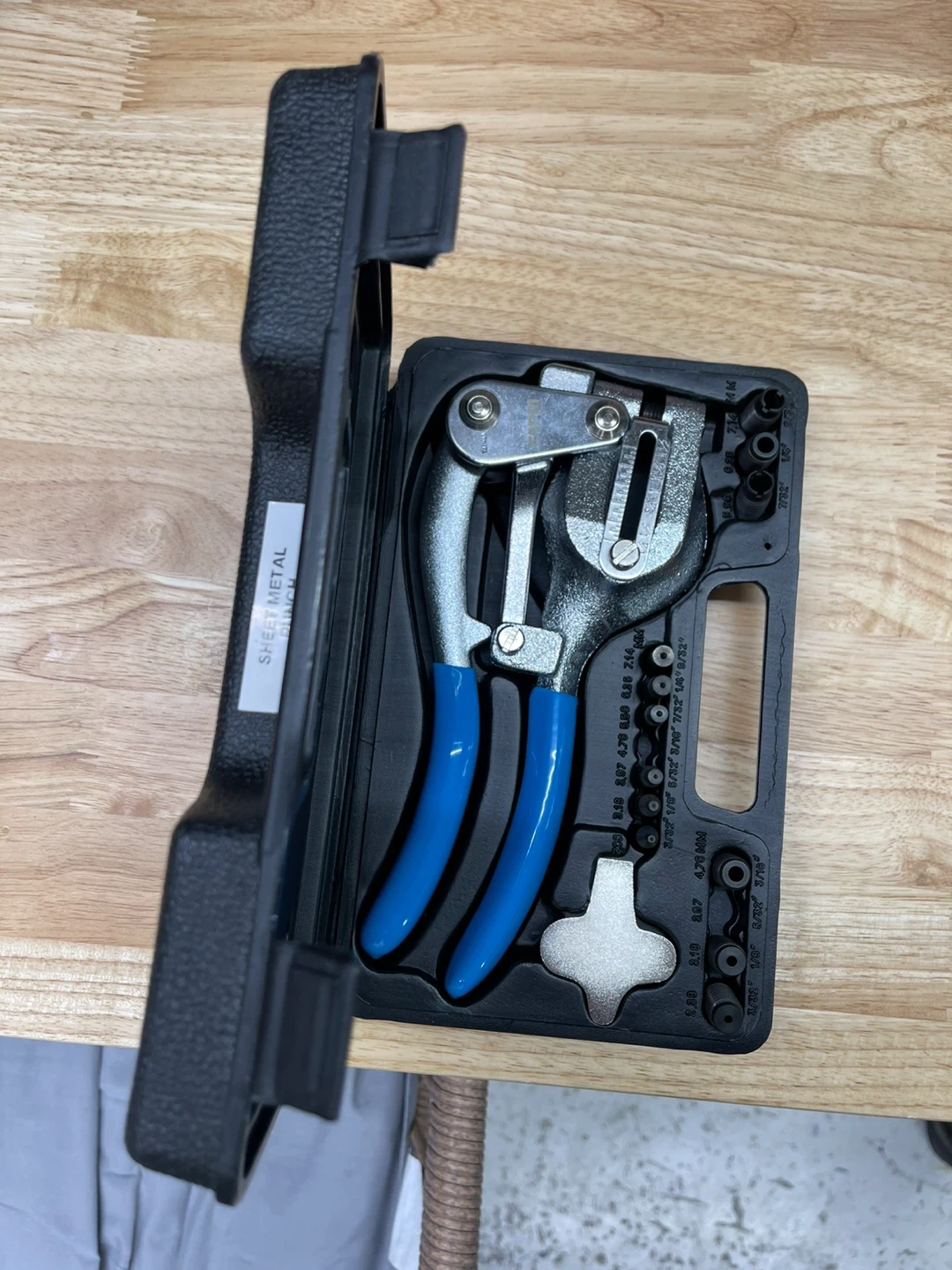 This Capri sheet metal punch set includes a punch tool and various punch sizes. The tool has blue handles and comes in a black carrying case. It's designed for punching holes in sheet metal. Includes multiple punch sizes for versatility!