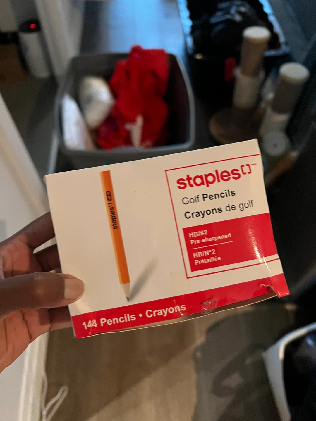 This is a box of 144 Staples Golf Pencils. They are HB/#2 hardness and come pre-sharpened. These pencils are suitable for scoring or general use.