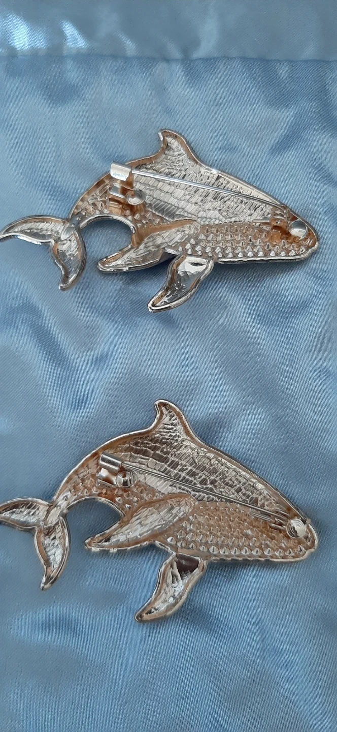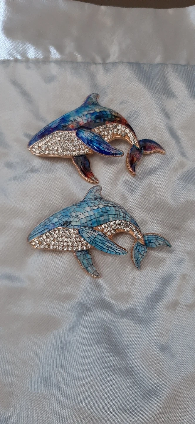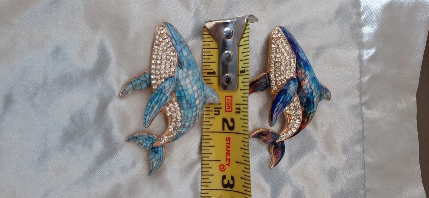 Cute dolphin-shaped brooches adorned with rhinestones and colorful enamel details. Each brooch measures about 2.5 inches long. They feature secure pin backs for easy attachment. A lovely accessory for any outfit!