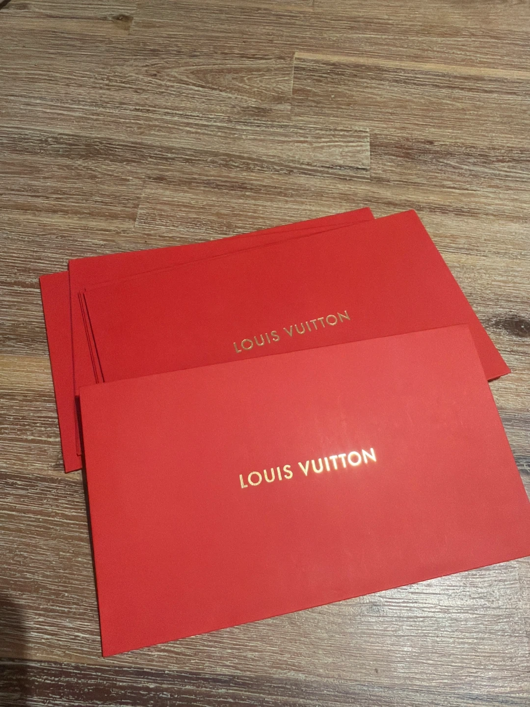 red Louis Vuitton envelopes. Gold clasp detail and embossed logo. Perfect for special occasions or gifting!