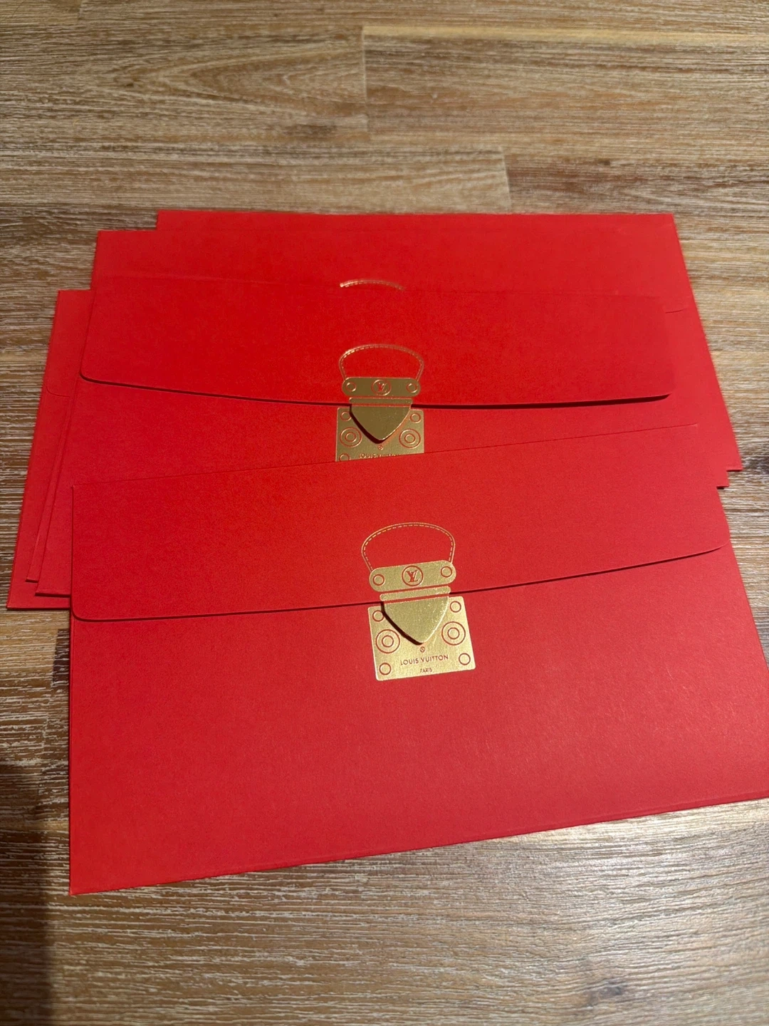red Louis Vuitton envelopes. Gold clasp detail and embossed logo. Perfect for special occasions or gifting!