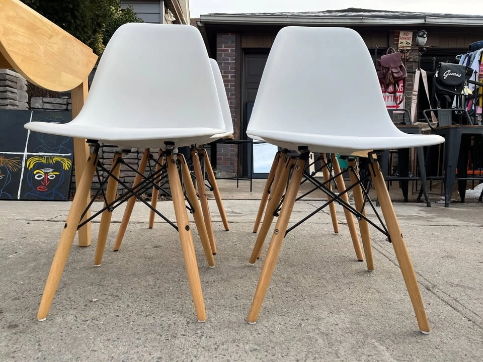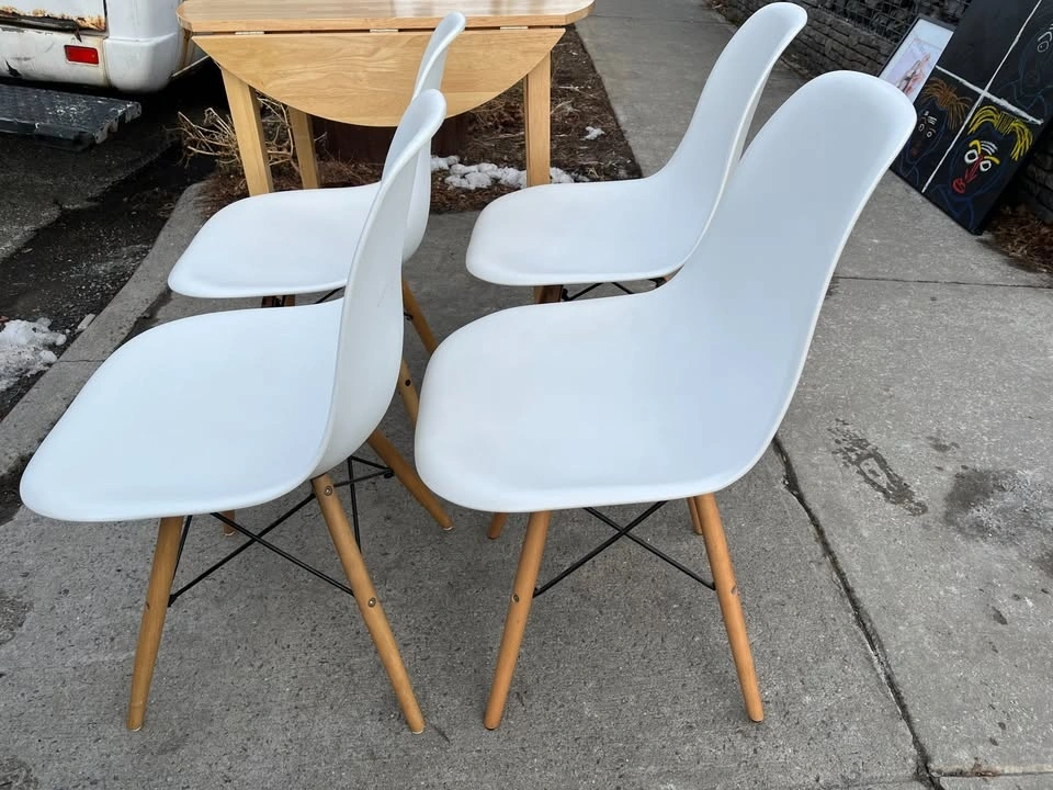 Used but still in great condition are 4 Mid Century Modern Dining Chairs with Wood Legs. These are armless kitchen chairs, suitable as plastic dining side chairs for your dining room, kitchen, or living room.
