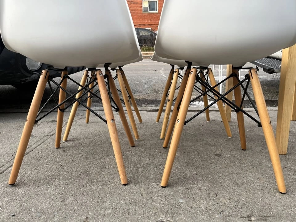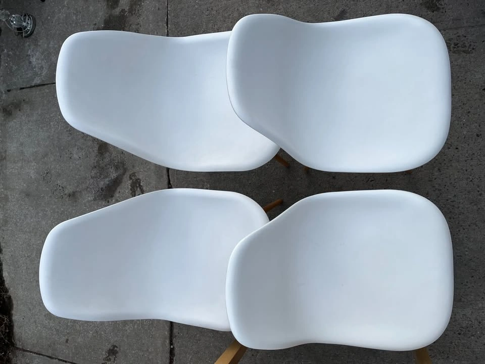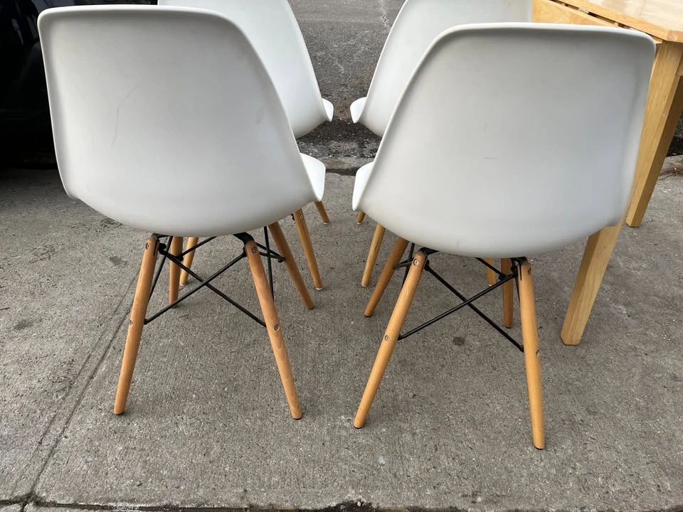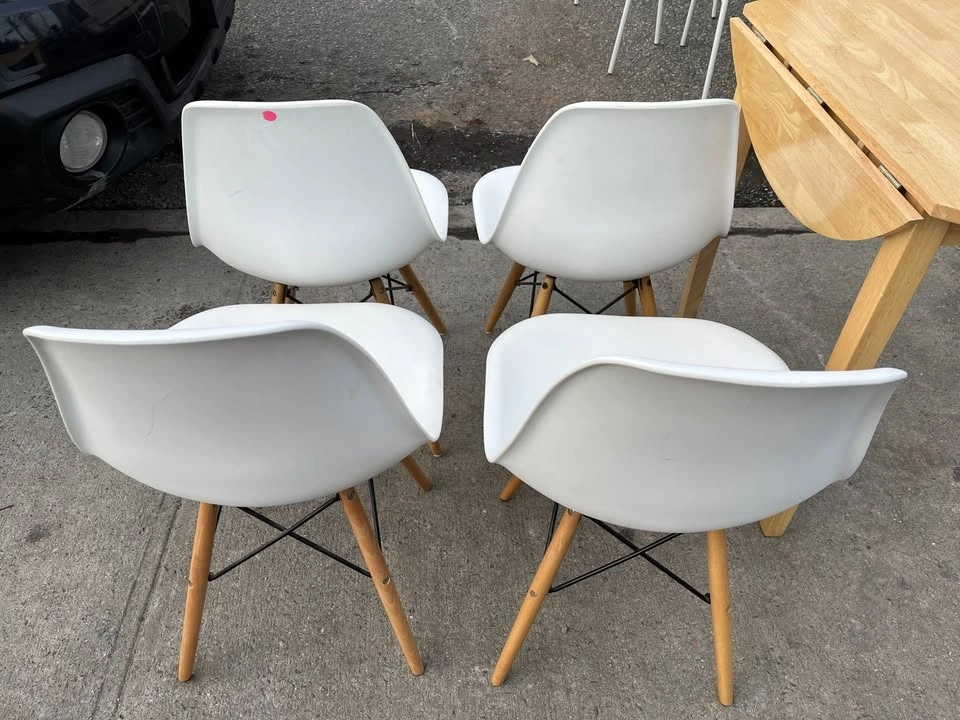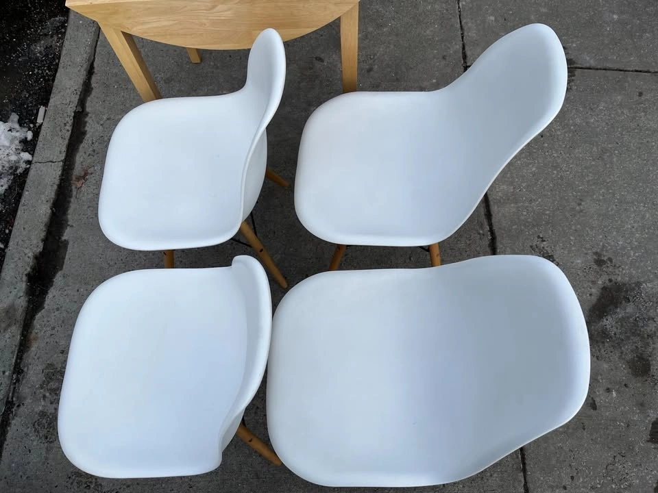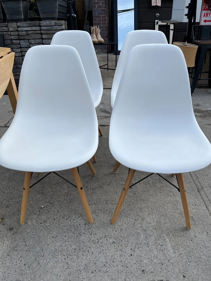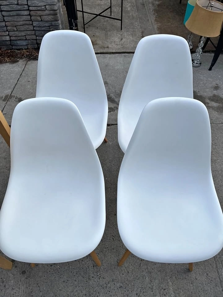 Used but still in great condition are 4 Mid Century Modern Dining Chairs with Wood Legs. These are armless kitchen chairs, suitable as plastic dining side chairs for your dining room, kitchen, or living room.