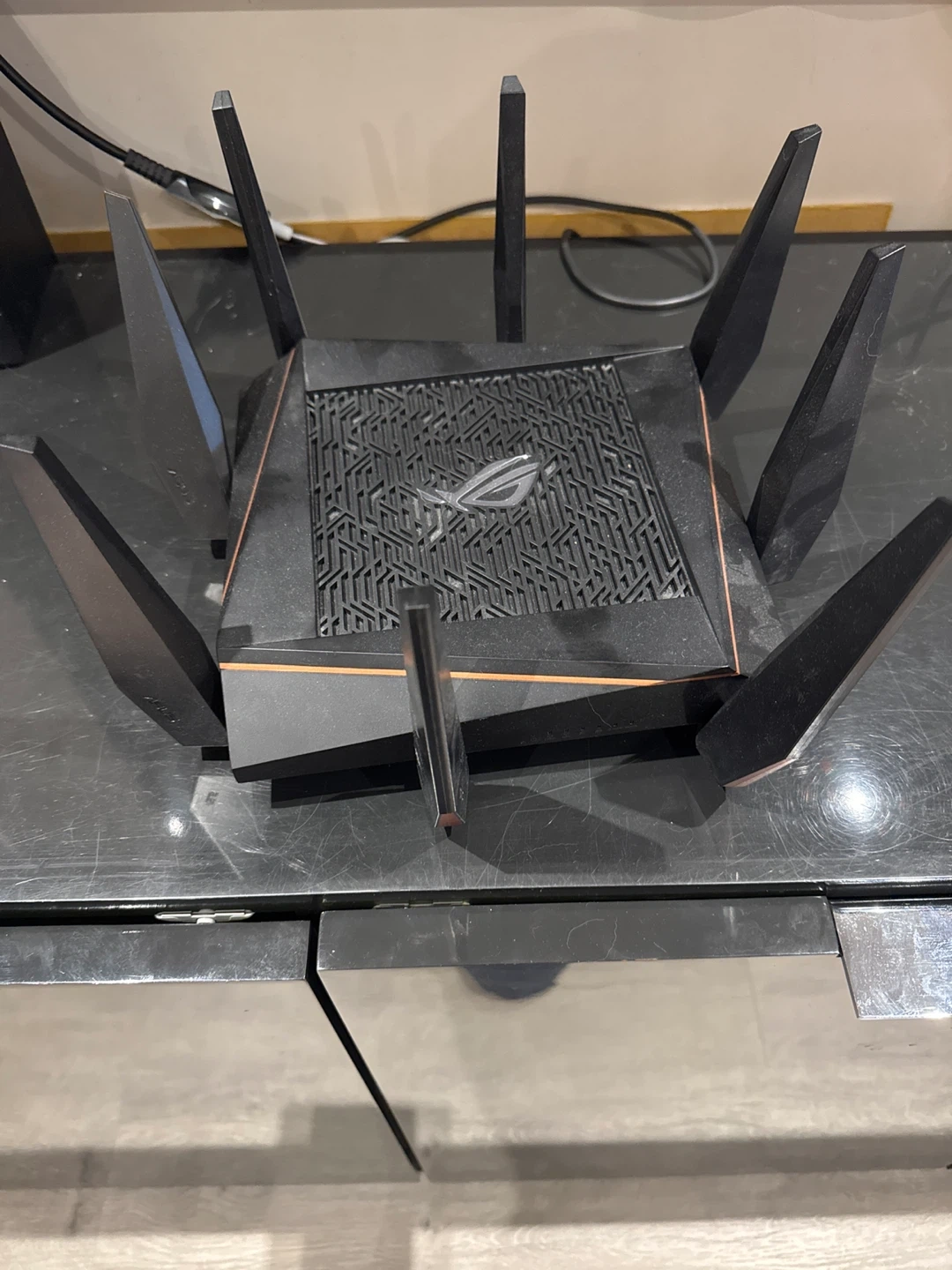 This is an ASUS ROG Rapture Tri-band Gaming Router. It operates at 2.4 GHz and 5 GHz. The input is 19V, 3.42A.