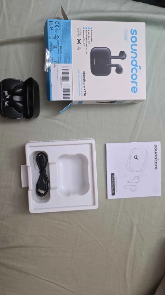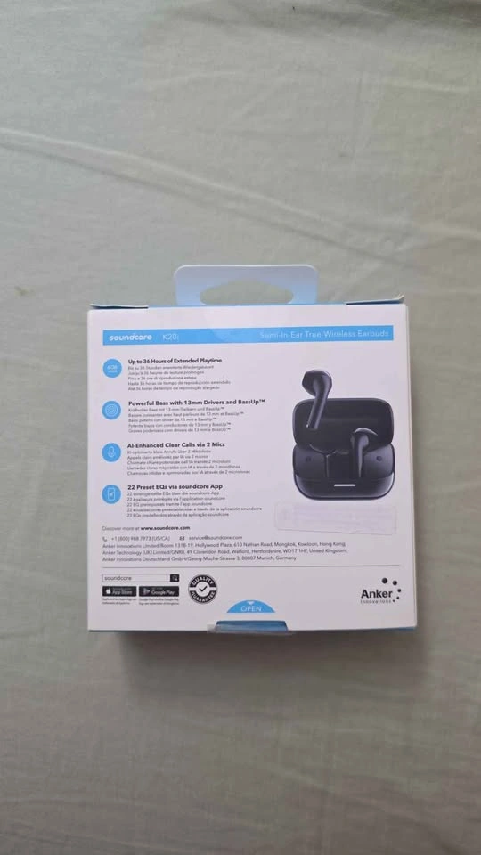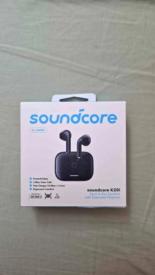 0Brand new soundcore K20i semi-in-ear wireless earbuds — Blue Up to 36 hours of total playtime with included charging case. Quick “10-minute” fast charge gives ~2 hours of playback — great when you're short on time. Lightweight, semi-in-ear design (approx. 3.3 g each bud) for all-day comfort without ear-tips. Dual-mic ENC (environmental noise cancellation) for clear calls even in noisy settings. Customizable sound via app with 22 preset EQs + your own settings; plus Game Mode for enhanced awareness of in-game sounds. IPX5 water-resistant so sweat or light rain won’t stop your music. https://a.co/d/1h2U82h Reason for selling - I got it as gift