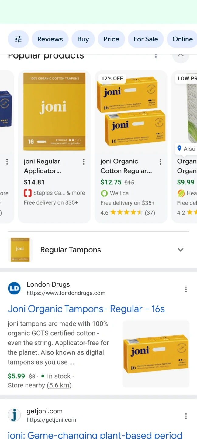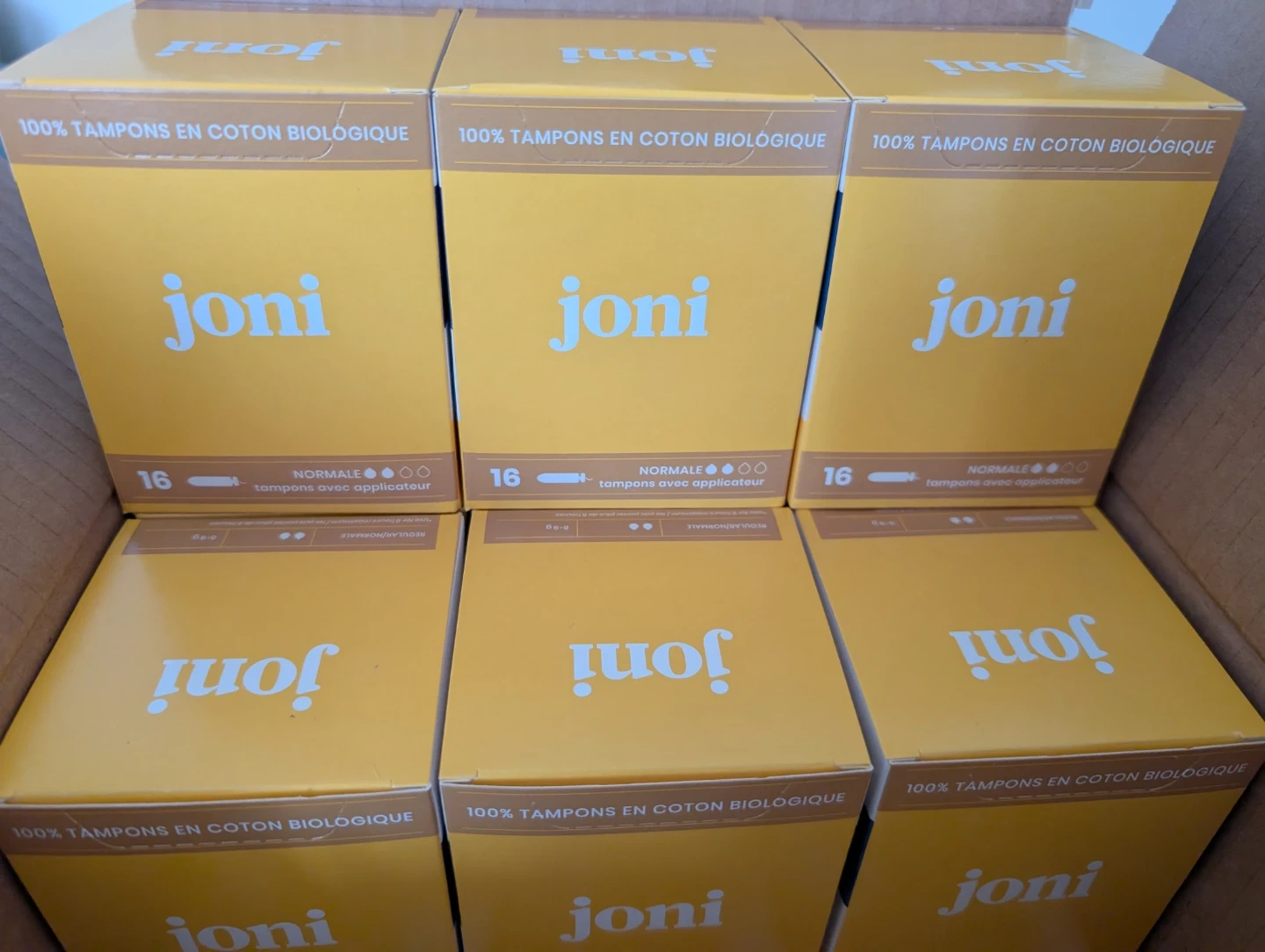 Joni 100% organic cotton tampons with applicators. Each box contains 16 tampons. Includes both Regular and Normal absorbencies.
