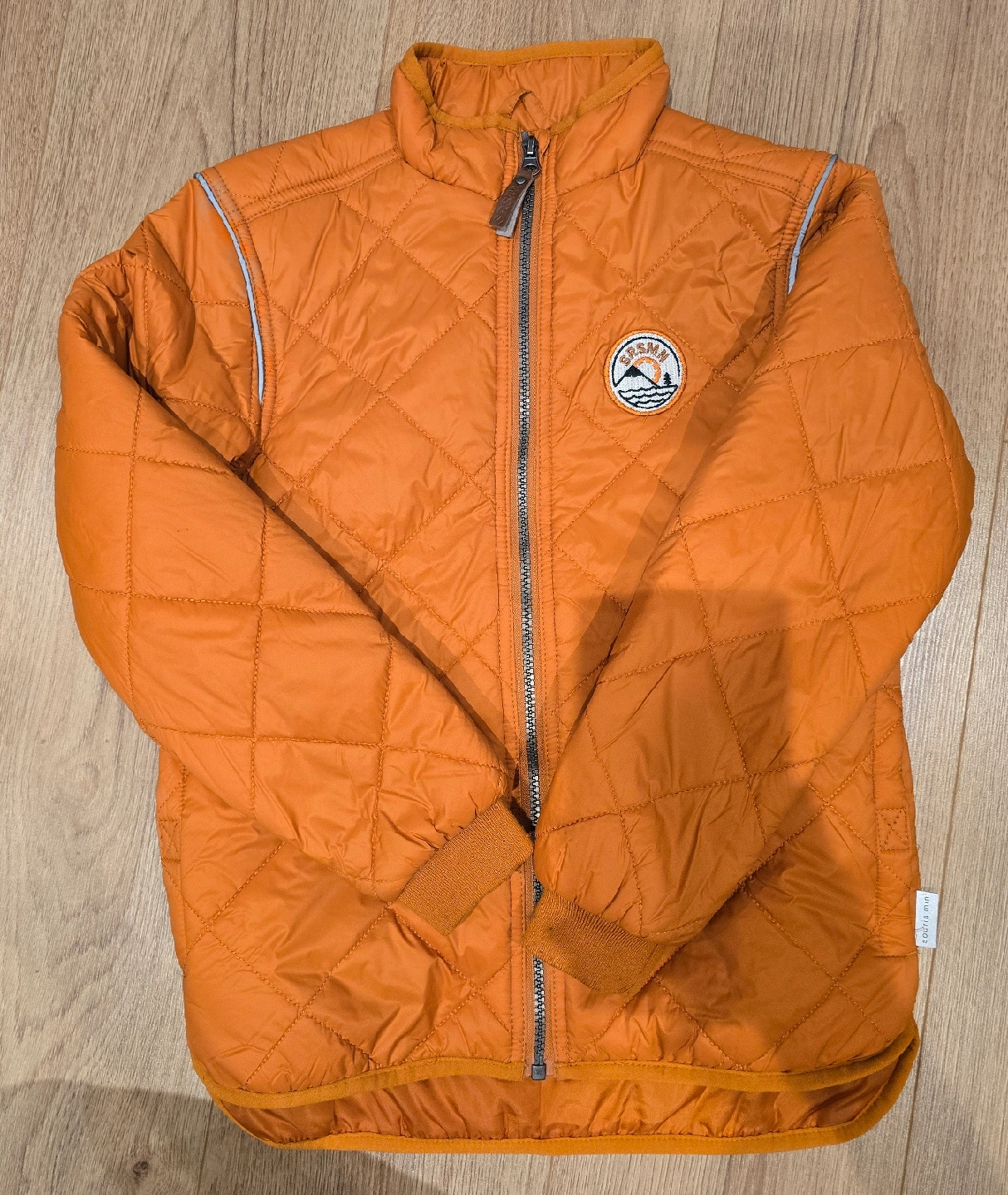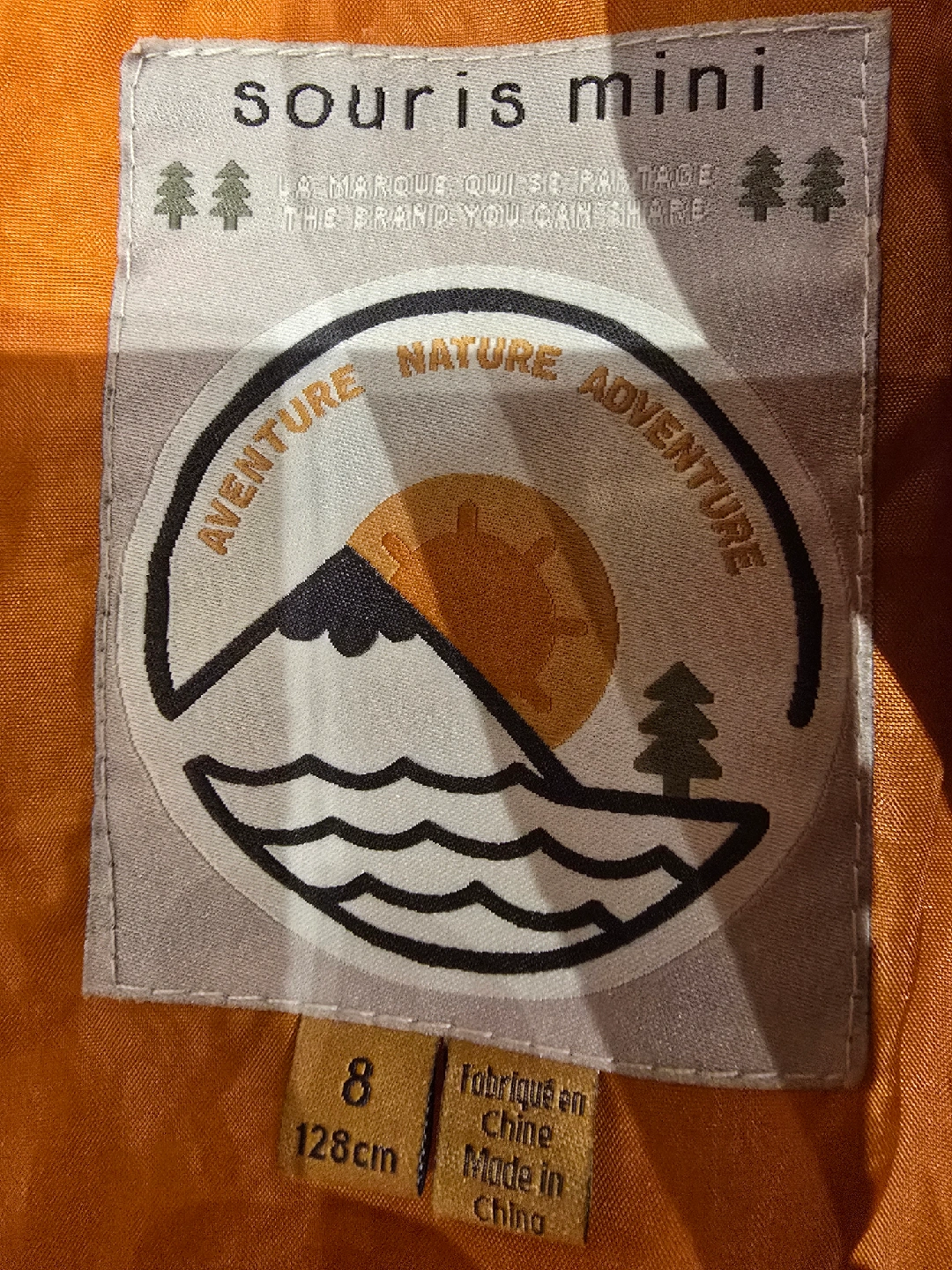 This cute Souris Mini quilted jacket is perfect for keeping your little one warm! It's in great condition and features a fun adventure-themed logo. The jacket is a size 8 (128cm) and has a cozy quilted design in a lovely orange colour. Great for outdoor adventures!