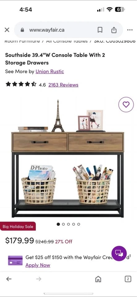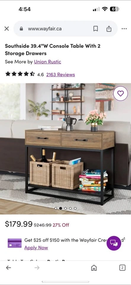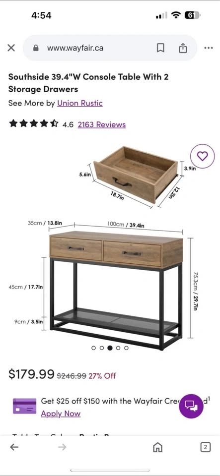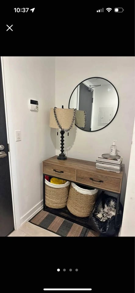 This table is in excellent condition and has two drawers with metal accents. It is a great addition to any entryway or living room.