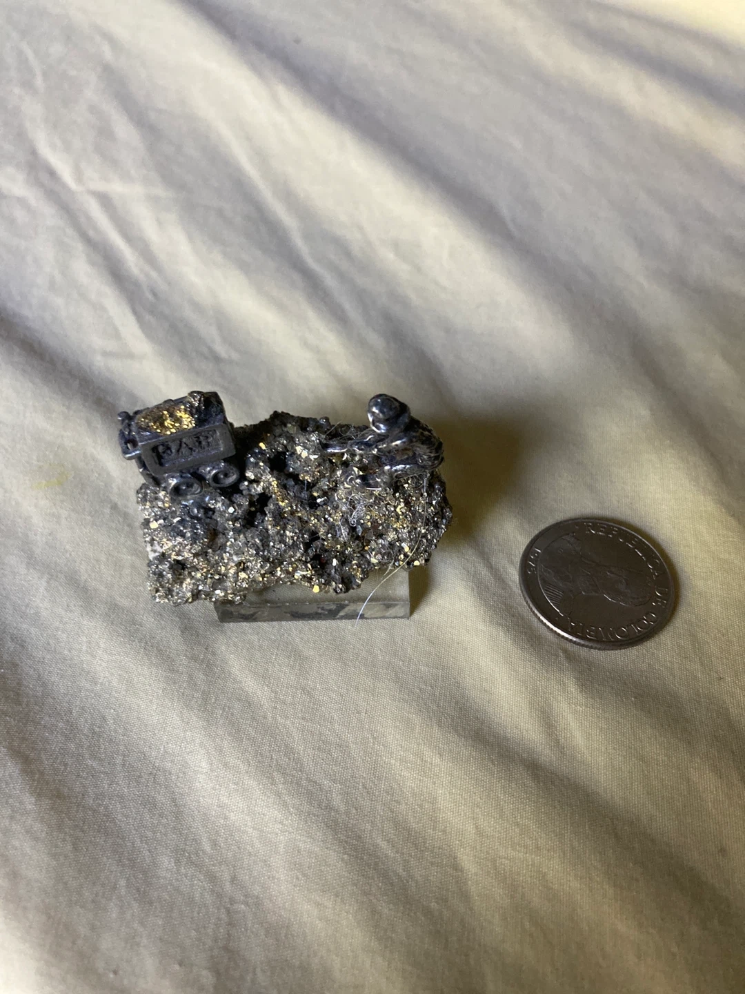 943Here's a specimen, also known as fool's gold, featuring a tiny train car on top. It's a unique and interesting piece for any rock or mineral collection! Coin in photo to show size of item.