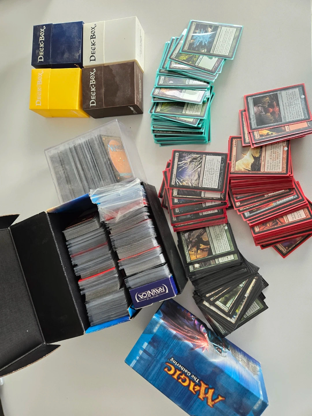 This lot includes a large collection of Magic: The Gathering cards in various sleeves and deck boxes. Perfect for any Magic fan looking to expand their collection or organize their cards!