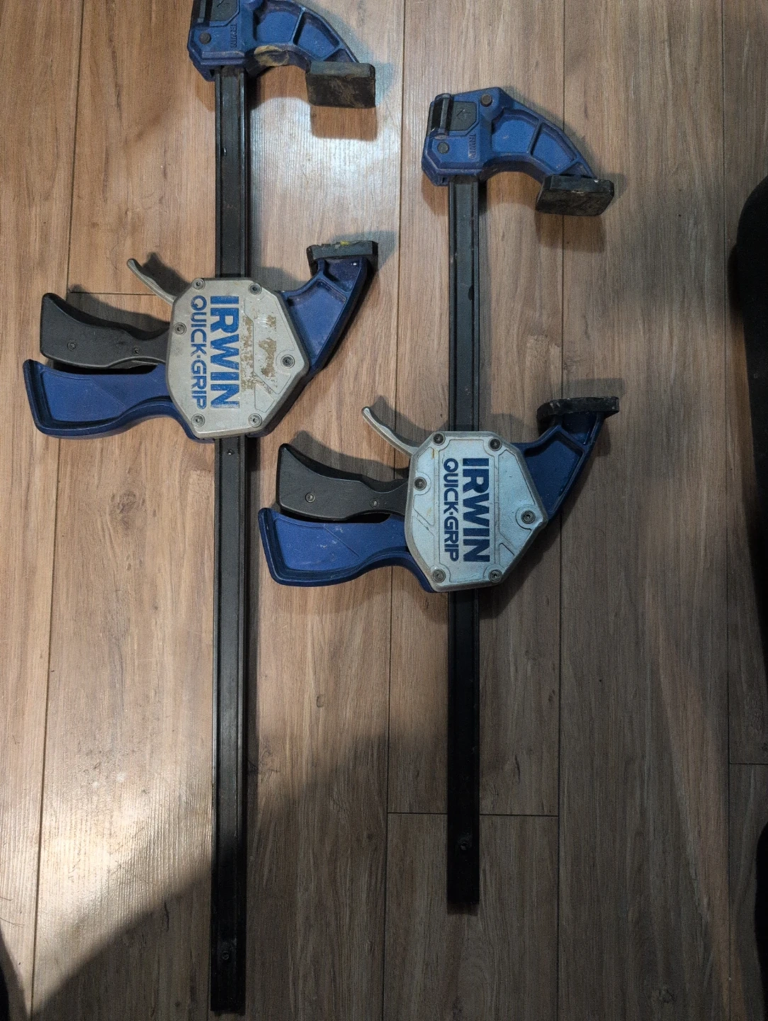 Two Irwin QuickGrip bar clamps and two X-PERT quick-release clamps. These clamps are useful for woodworking projects and general repairs. They offer a quick and secure grip for holding materials together.