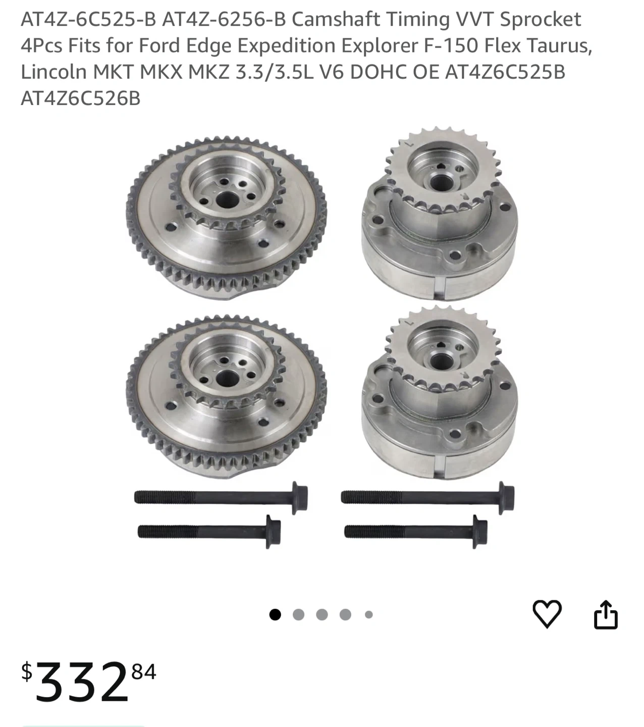 Selling a set of 4 camshaft timing VVT sprockets. These fit various Ford and Lincoln vehicles from 2011-2020, including Edge, Expedition, Explorer, F-150, Flex, and more. Please check the vehicle fitment in the photos to ensure compatibility with your car.