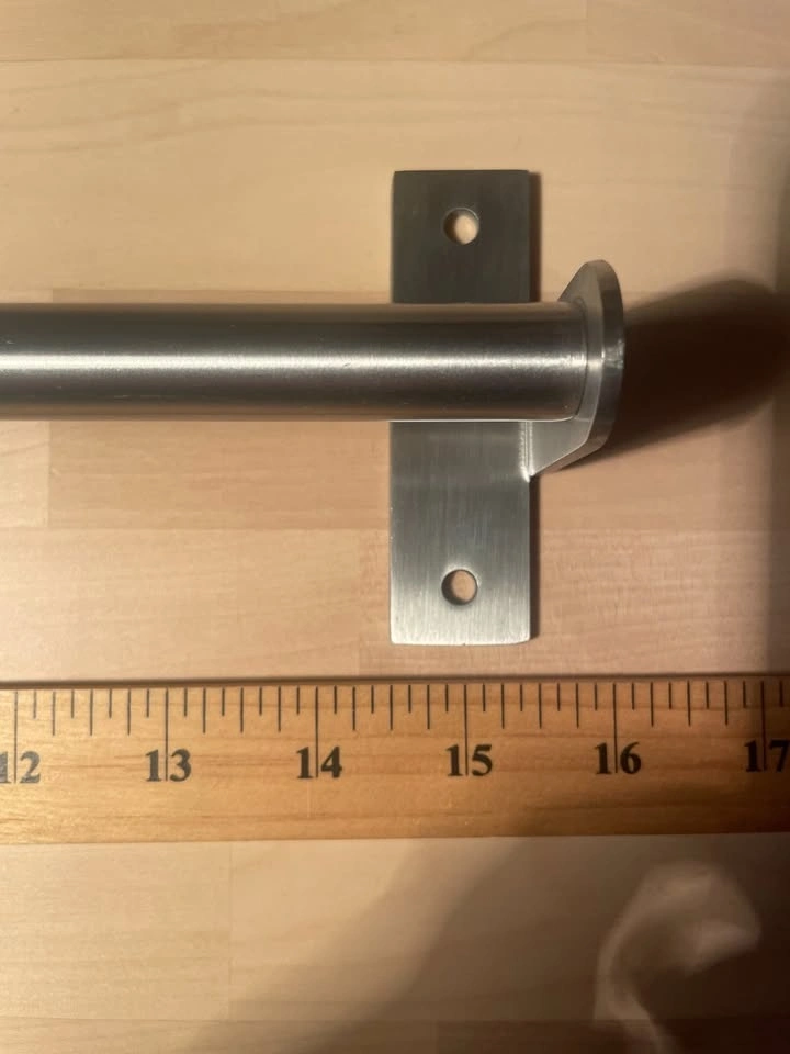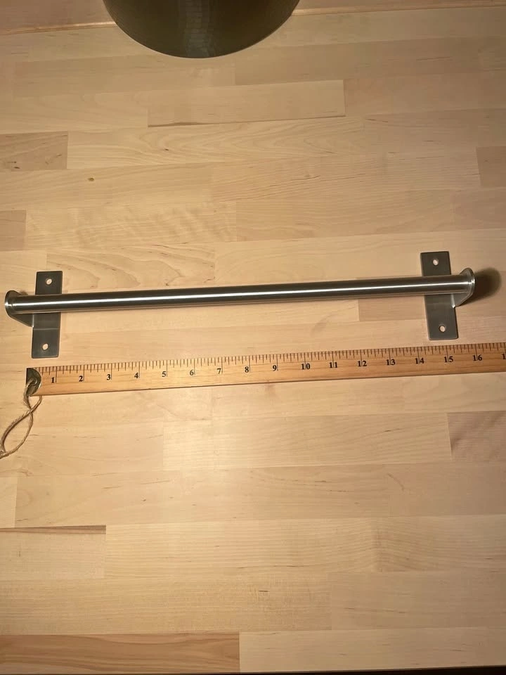 Stainless steel wall-mounted towel bar.