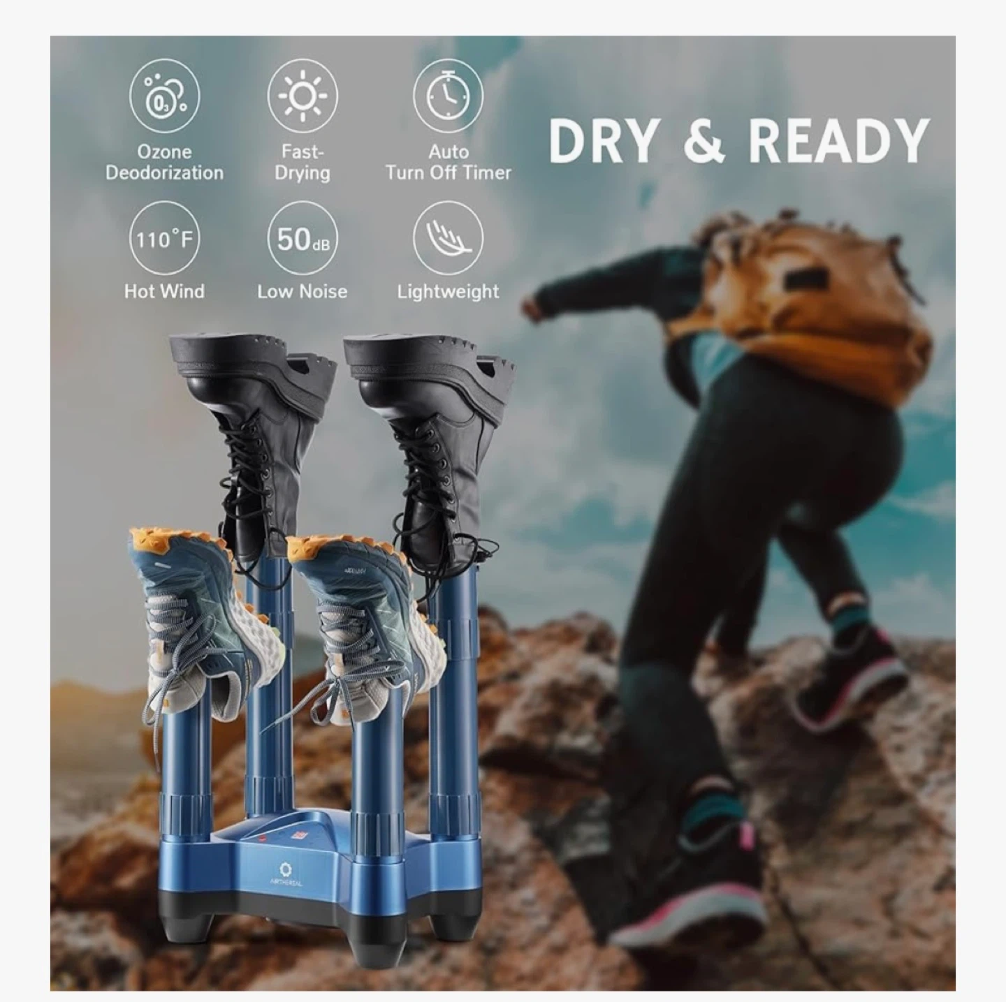This AIRTHEREAL SD20 boot dryer offers fast drying with hot wind. It features ozone deodorization and a low noise operation. The adjustable timer allows for customized drying cycles.