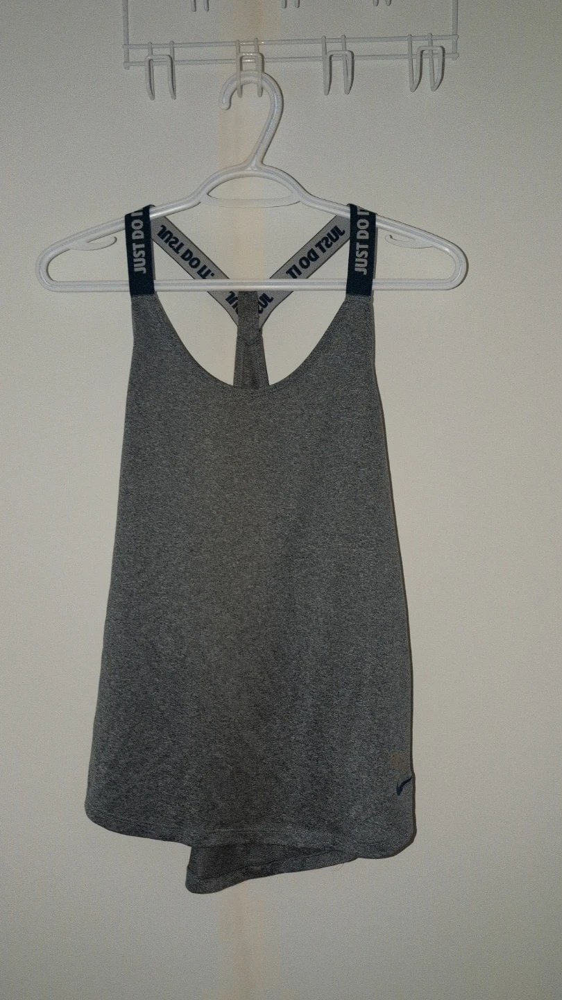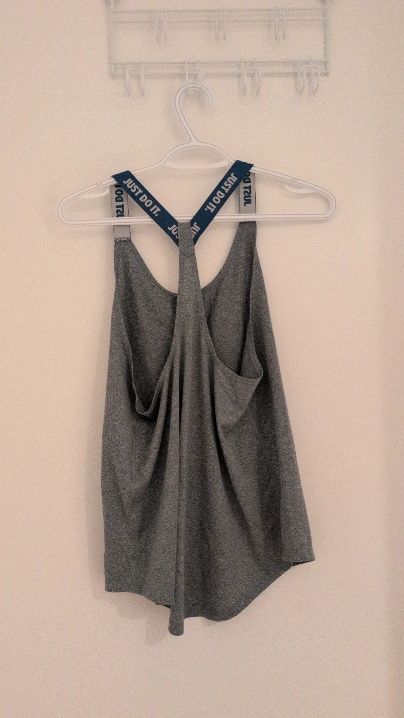 A grey Nike tank top with a racerback design. The straps feature the "Just Do It" slogan in repeating text. Made from a soft, breathable fabric.