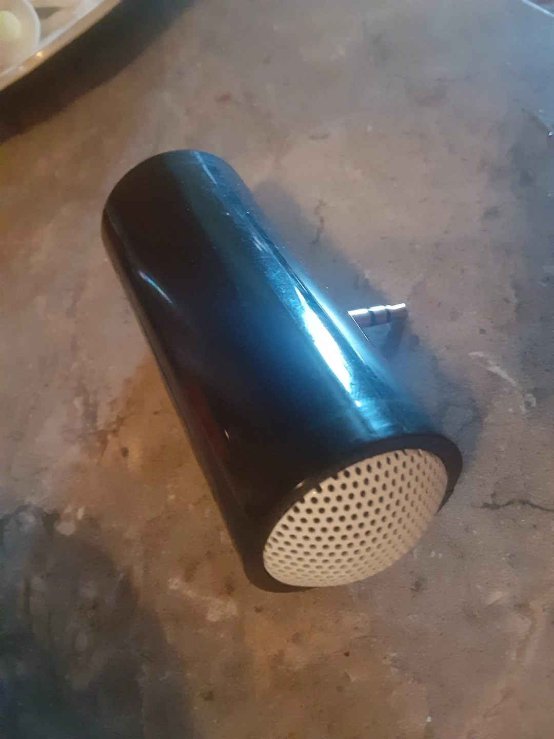 This black cylinder speaker plugs into any 3.5mm audio jack. It's a compact portable speaker. Great for taking music on the go!