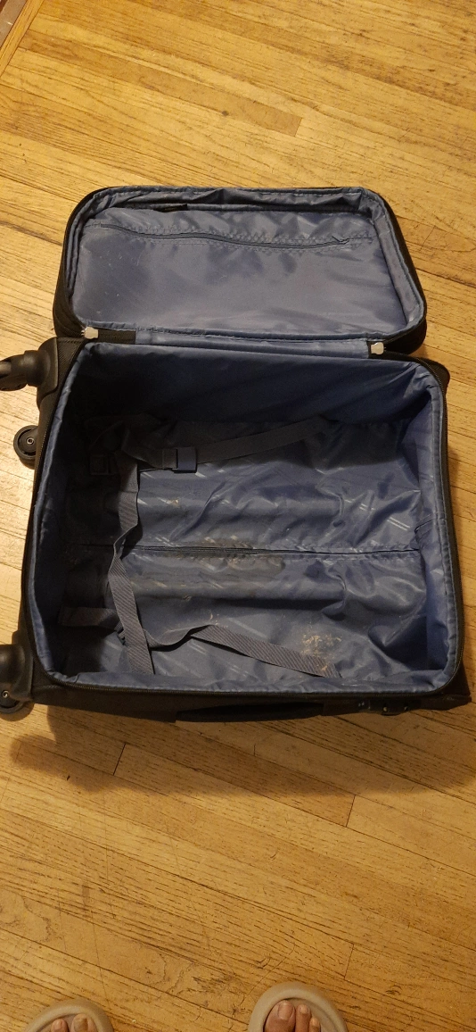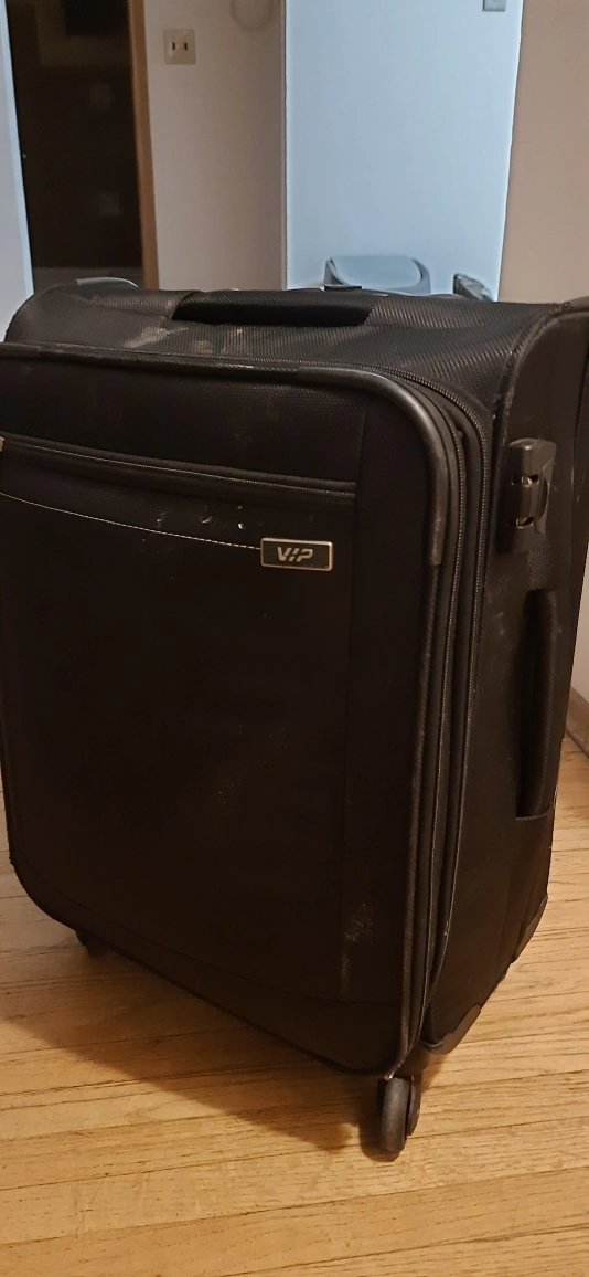 Selling a black Carry-on rolling suitcase from VIP. It's in used condition, but still works great for travel! It has a retractable handle and multiple compartments for easy packing. Perfect for your next trip!