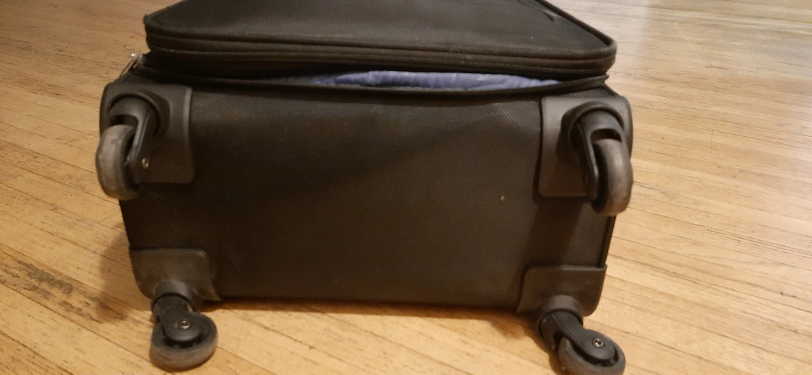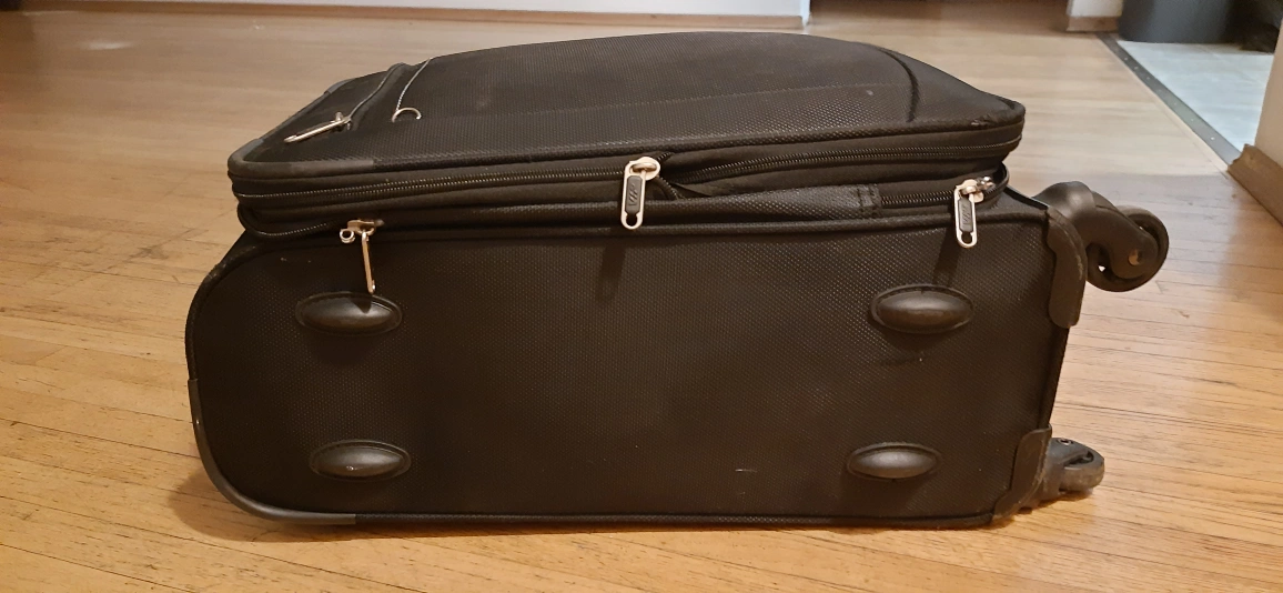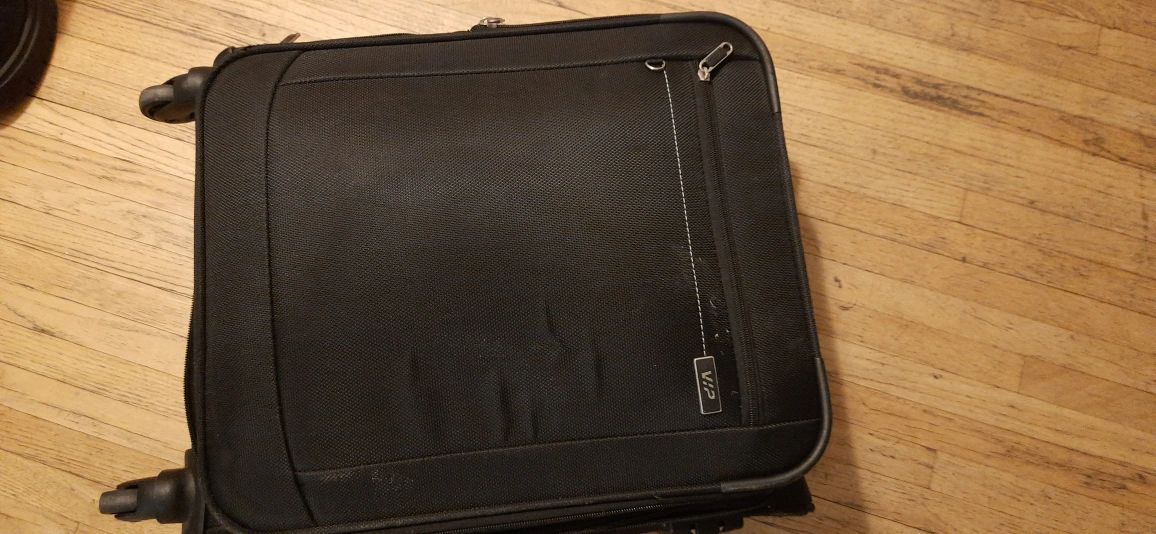 Selling a black Carry-on rolling suitcase from VIP. It's in used condition, but still works great for travel! It has a retractable handle and multiple compartments for easy packing. Perfect for your next trip!