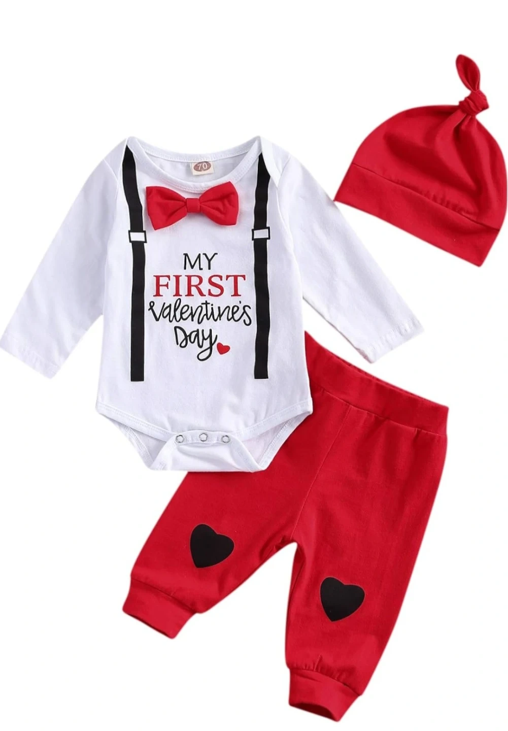 This adorable three-piece set is perfect for your little one's first Valentine's Day! It includes a white long-sleeve bodysuit with a cute red bow tie and suspender print, red pants with black heart details, and a matching red knotted hat. Size 0-3 month. Bought a month before valentines and it didn't end up fitting baby anymore