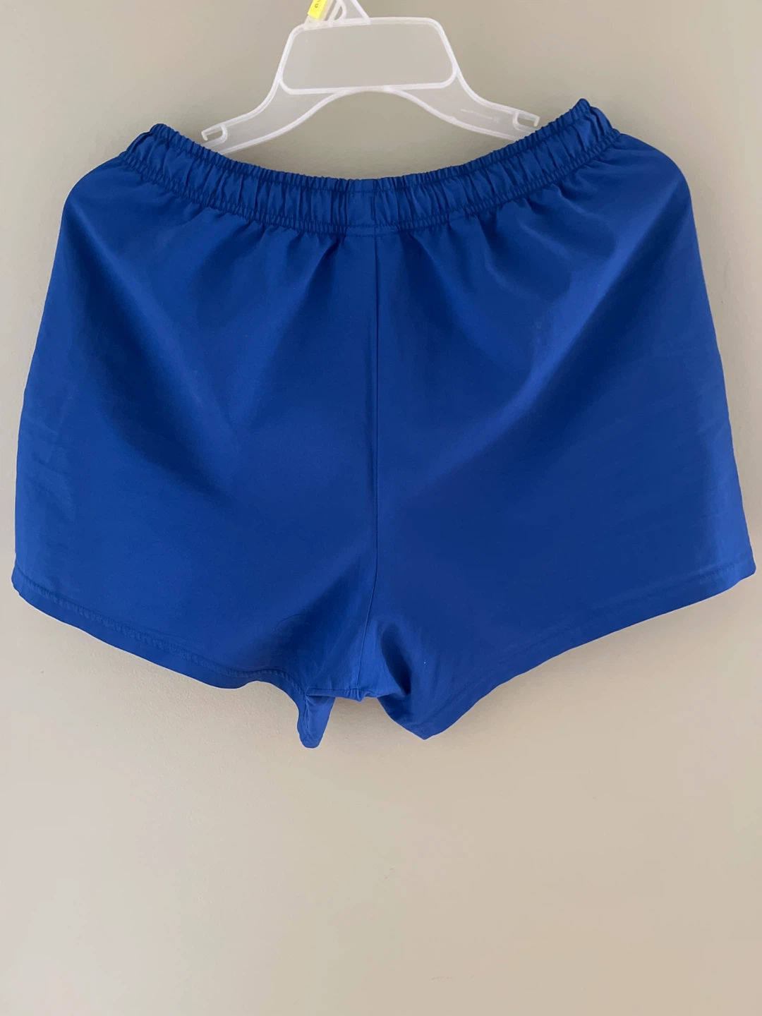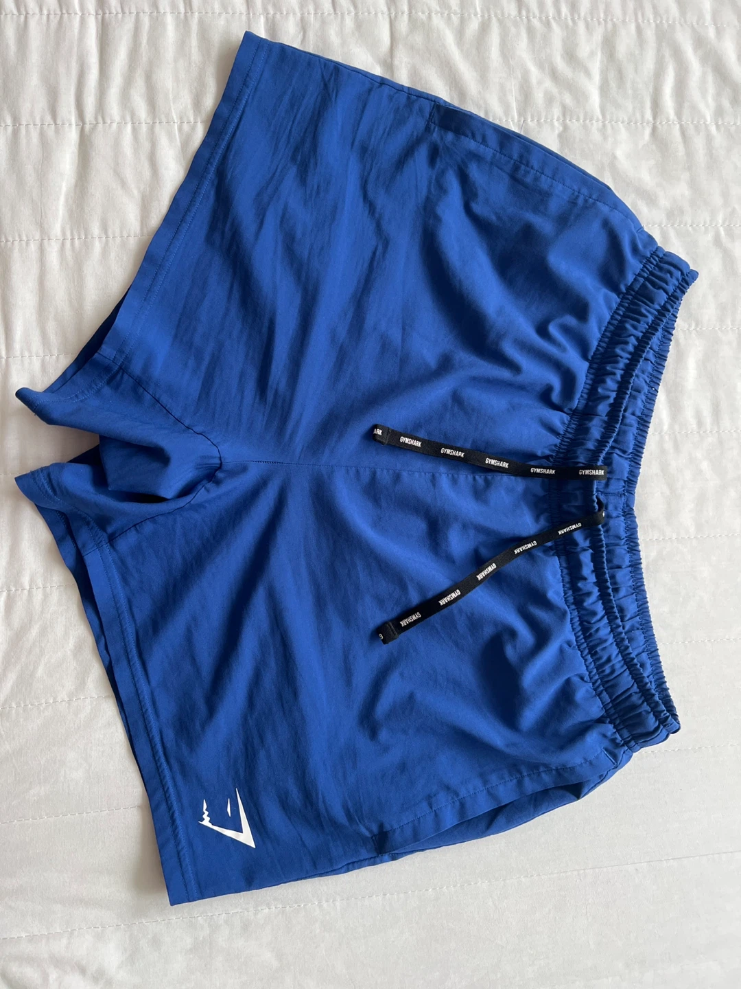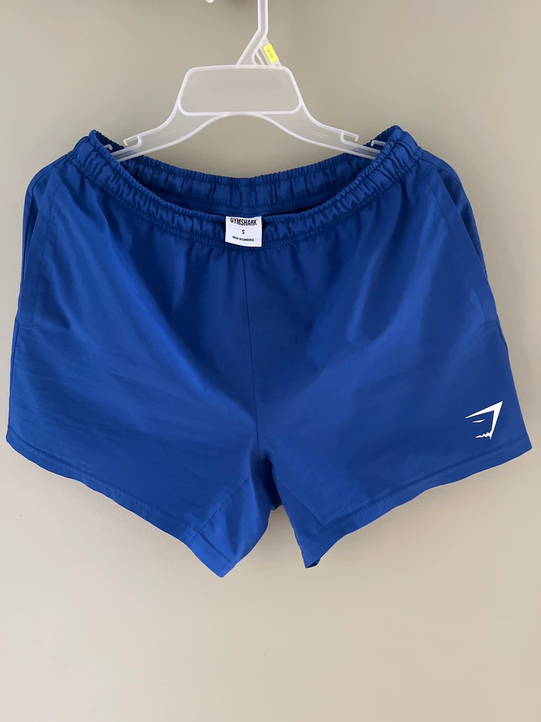 Gymshark athletic shorts in a vibrant blue. Elastic waistband with a drawstring closure. Size S, made with lightweight fabric for comfort .