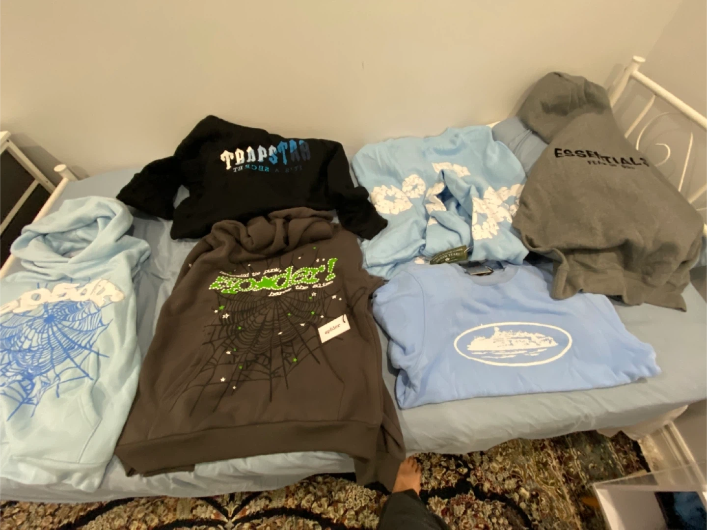 Brand new never worn not ten dollars Sp5der blue 100$ Size m Denim tears blue 80$ size s Sp5der gray 75$ size m Essentials dark gray 75$ size m Cortiez and trapstar 60$ size m and size s