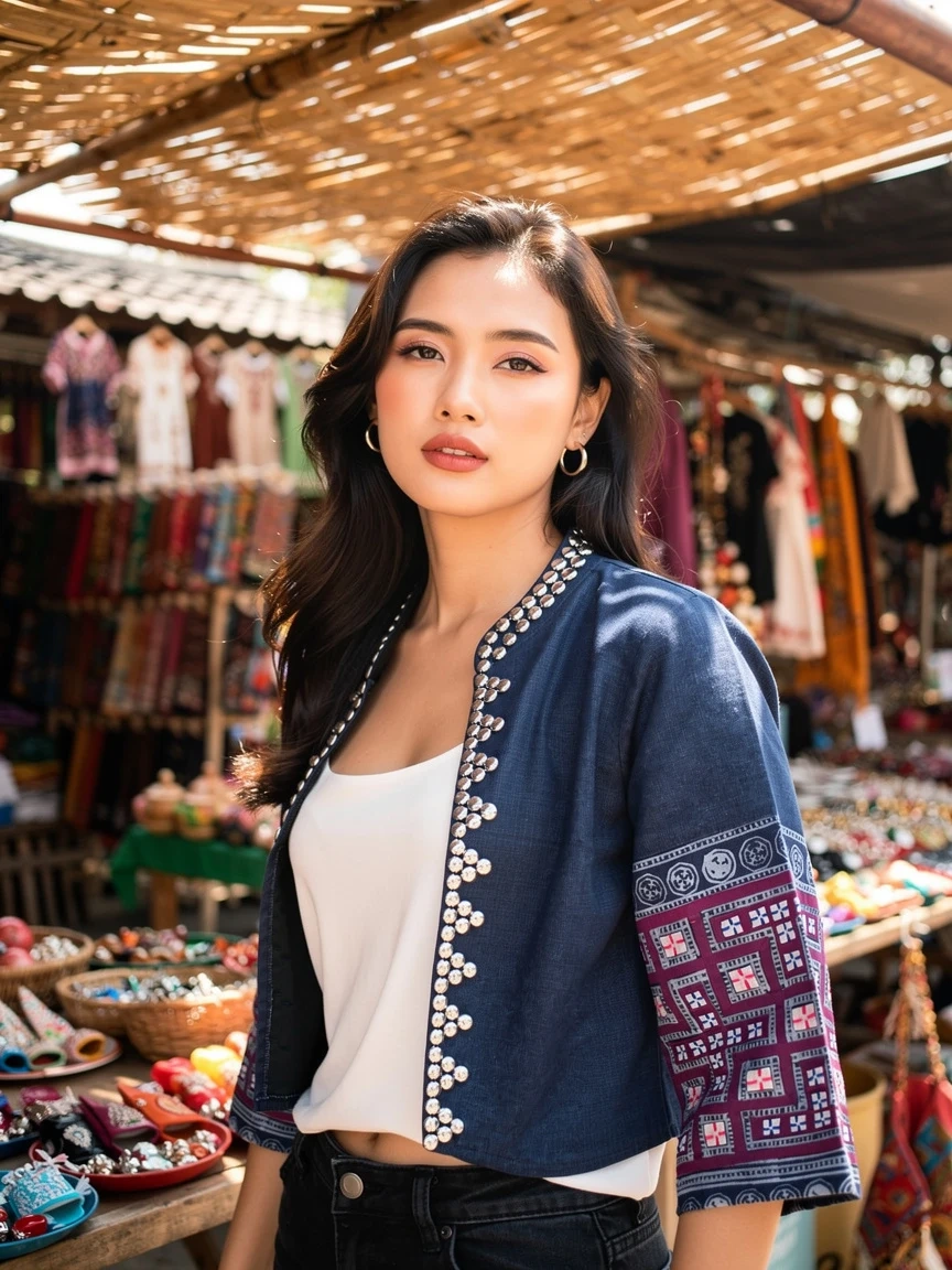 Designed with Hill Tribe–inspired patchwork textile panels on the sleeves and finished with decorative silver buttons along the front seam and neckline.