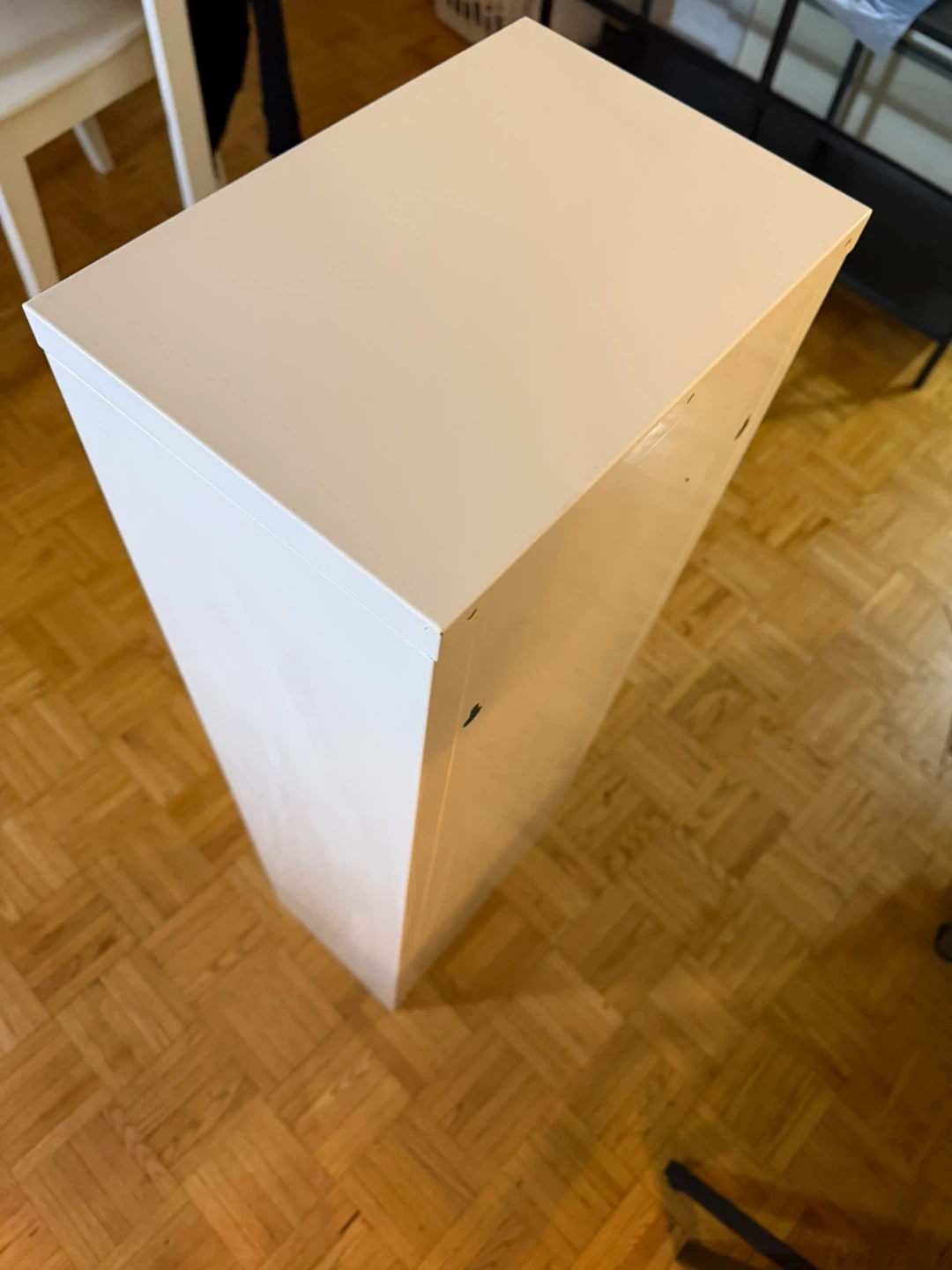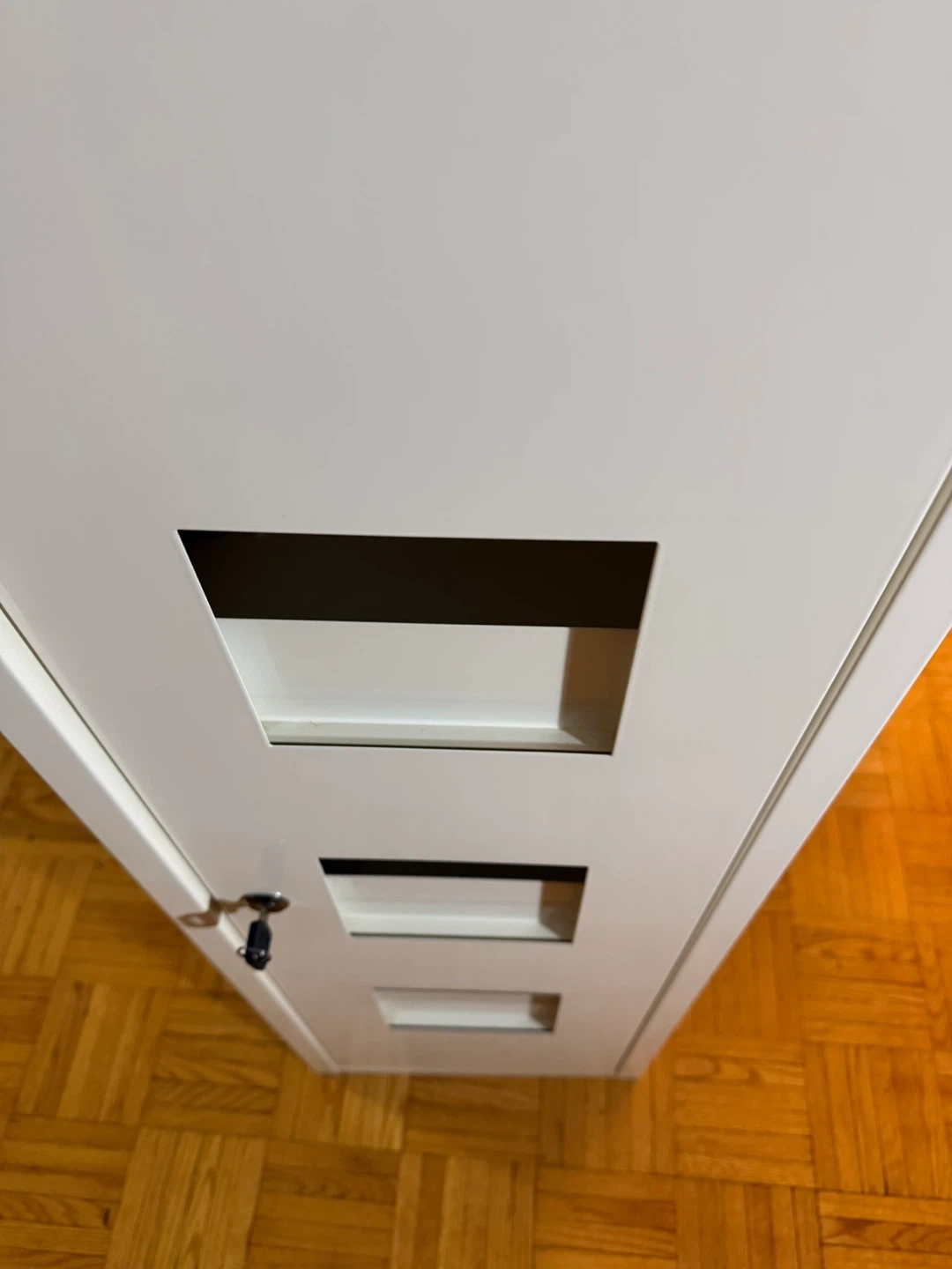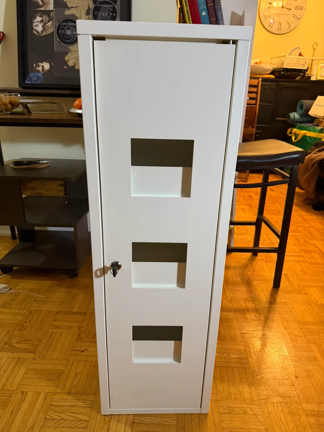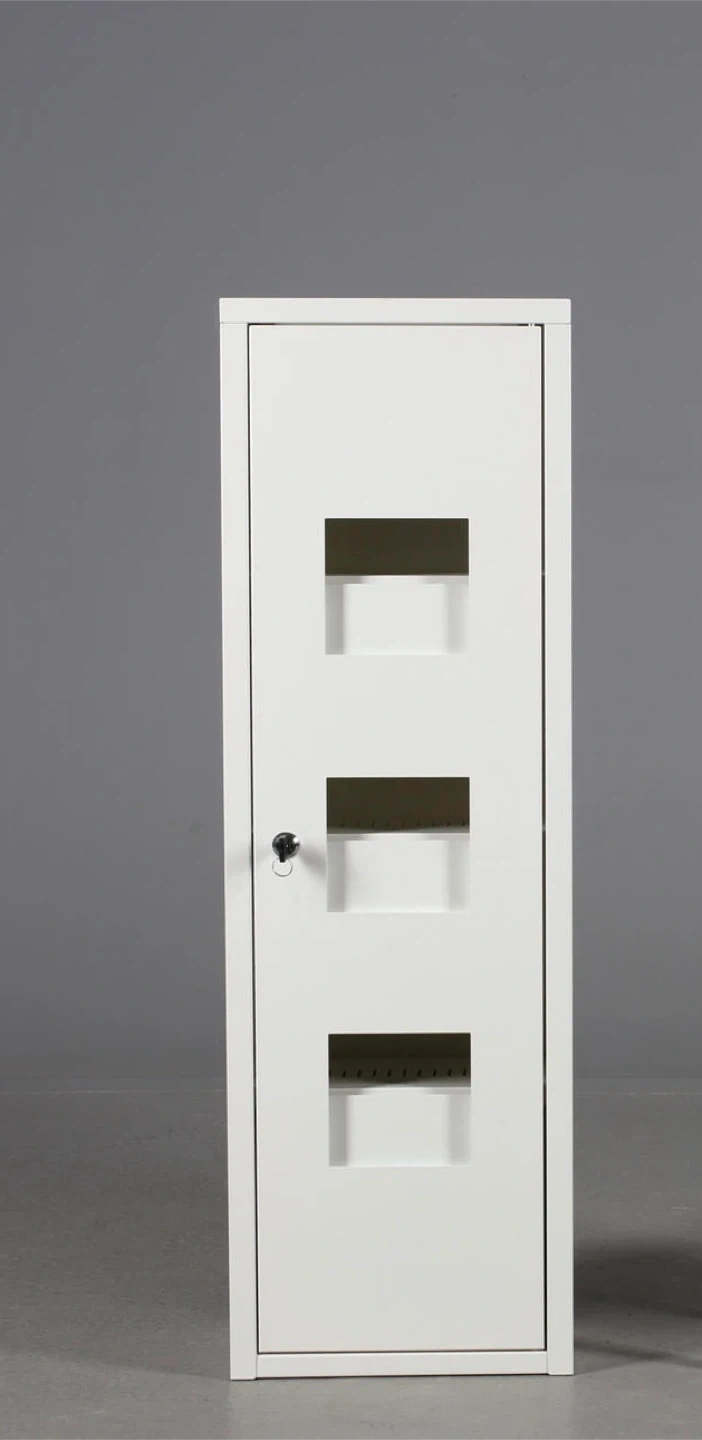 A white metal cabinet with open shelving compartments behind a lockable door. It's tall and narrow, perfect for storing various items. The door has a key lock.
