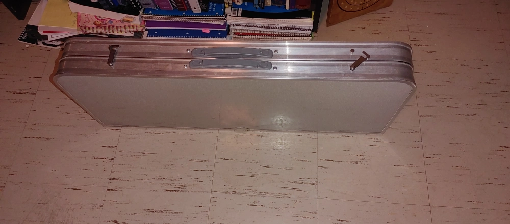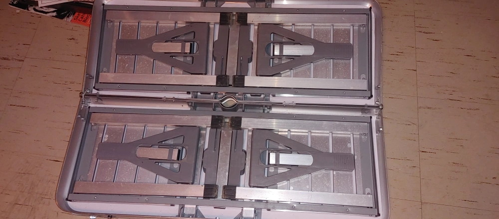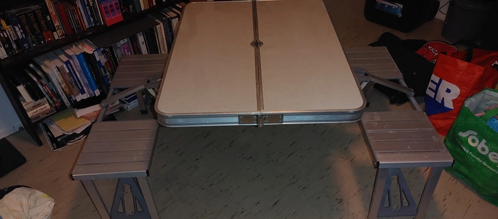 Selling a vintage folding suitcase picnic table! It's a unique piece that folds up into a suitcase for easy storage and transport. Perfect for picnics, camping, or even as an extra table for gatherings. It's in good condition for its age, with some signs of wear that add to its charm. A great conversation starter!