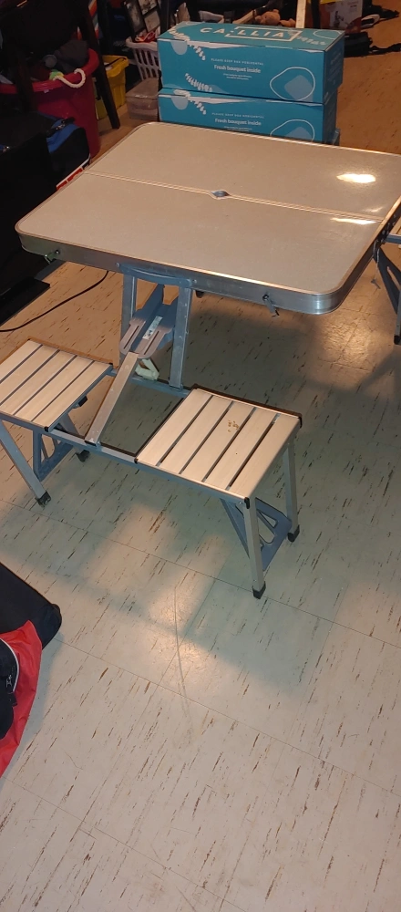 Selling a vintage folding suitcase picnic table! It's a unique piece that folds up into a suitcase for easy storage and transport. Perfect for picnics, camping, or even as an extra table for gatherings. It's in good condition for its age, with some signs of wear that add to its charm. A great conversation starter!