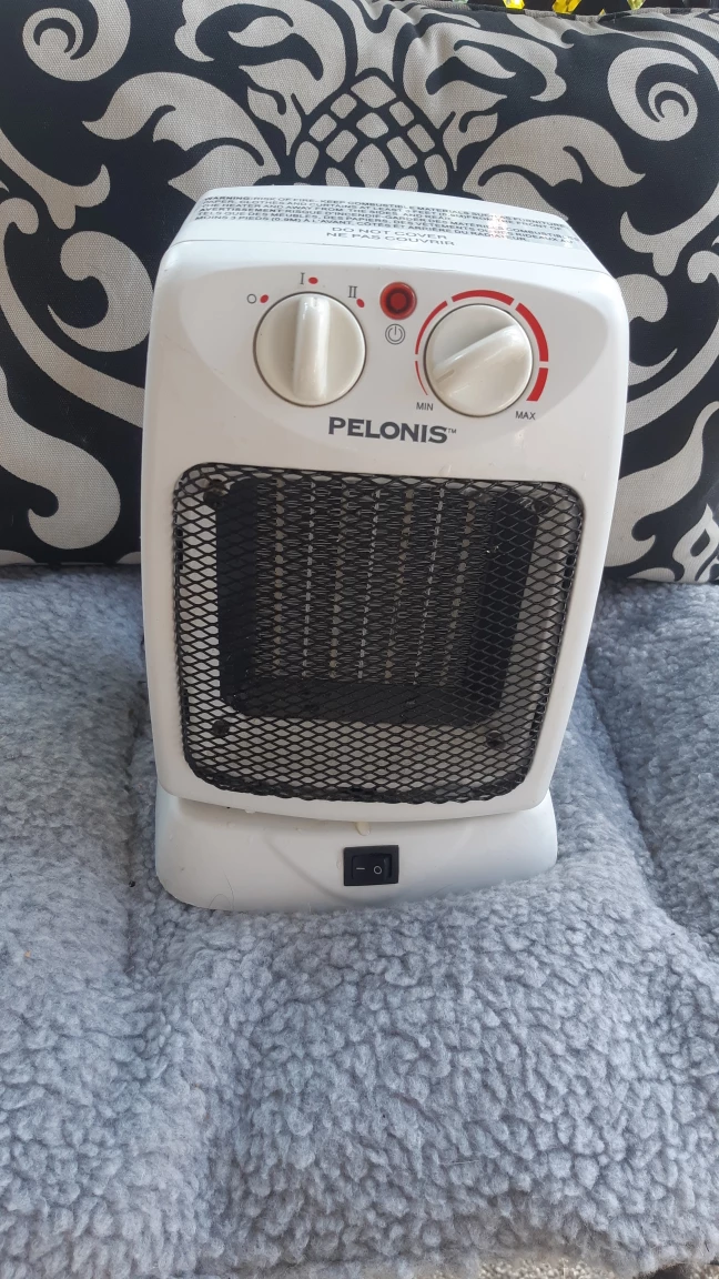 White Pelonis space heater with two heat settings and a power switch. It also has an overheat protection sensor. oscillates
