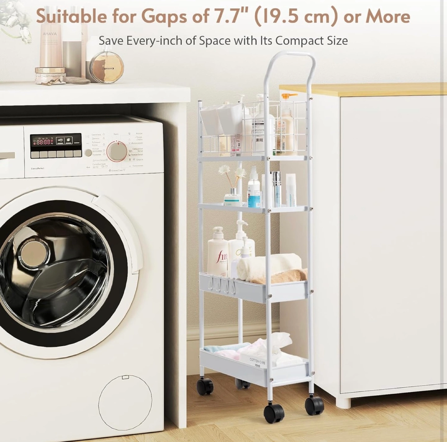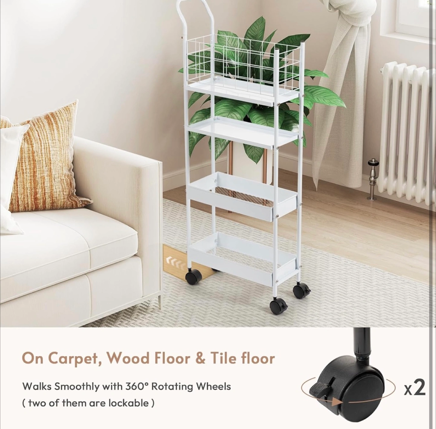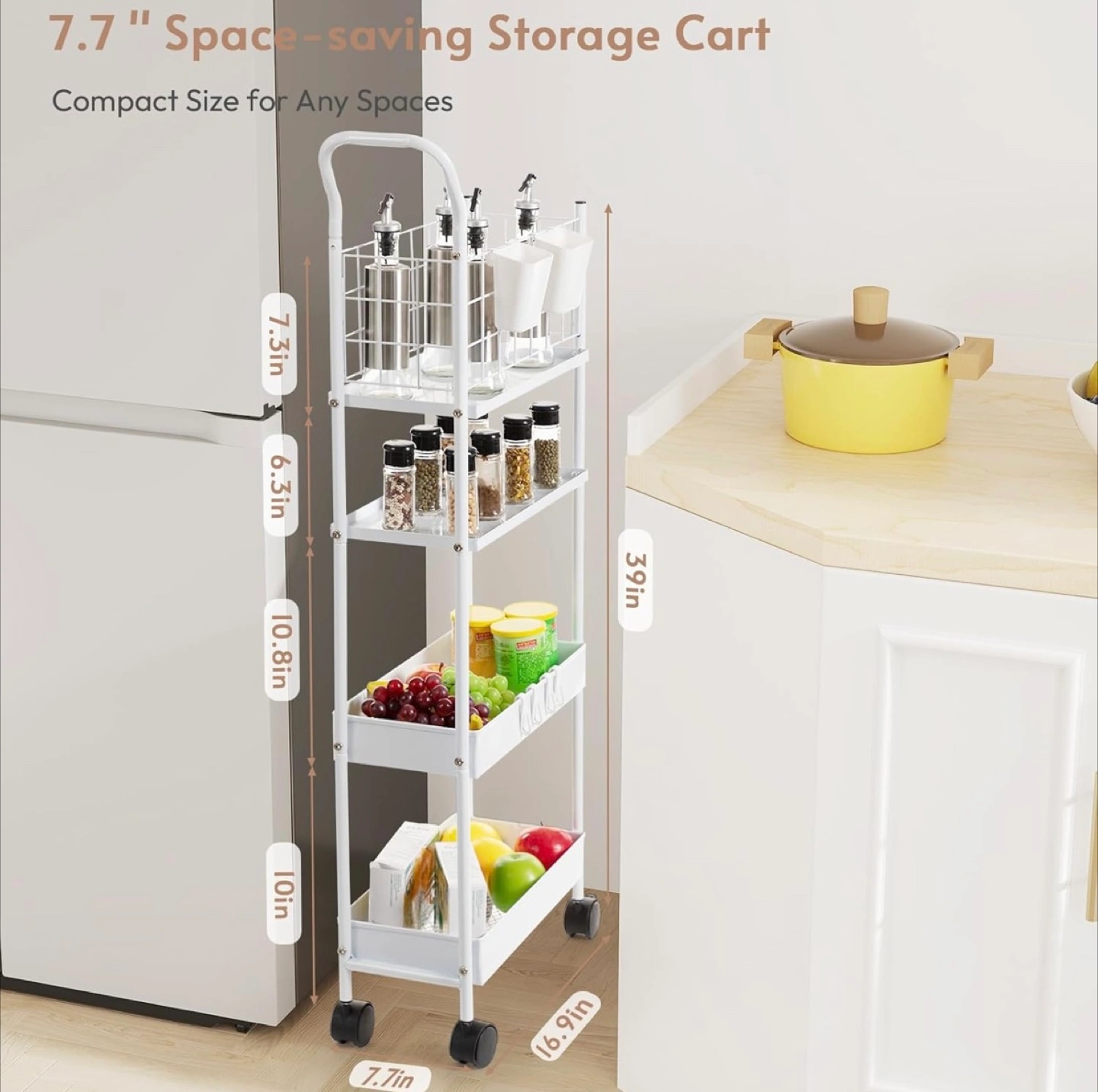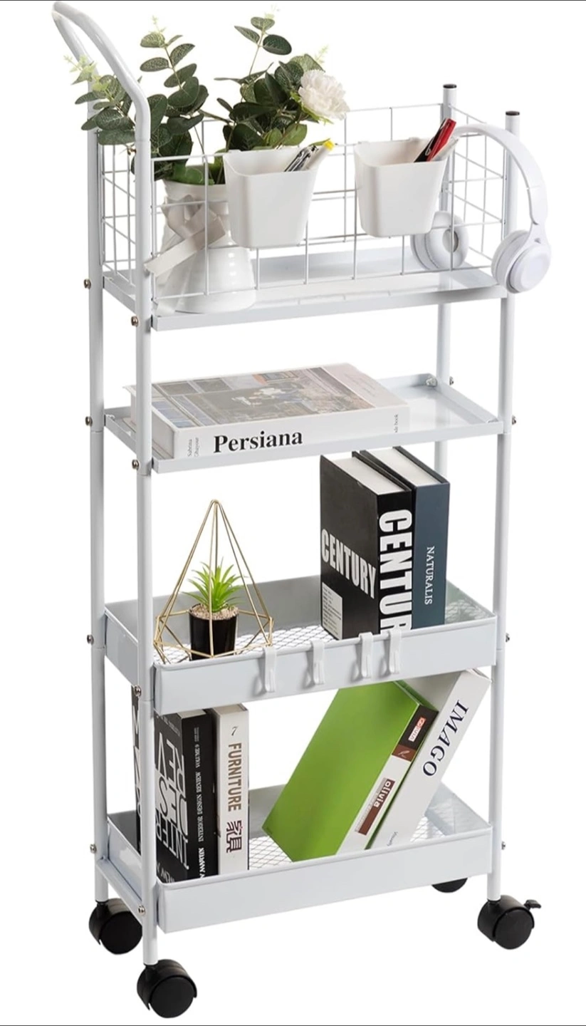 Looking to organize your space? This 7.7" space-saving storage cart is perfect for any room! It features a thickened metal frame, making it sturdy and robust. The breathable metal basket allows for air circulation, and it can handle a max load of 20 lbs. Plus, the high fence design prevents items from falling off. Installation is a breeze, set up within 10 minutes!