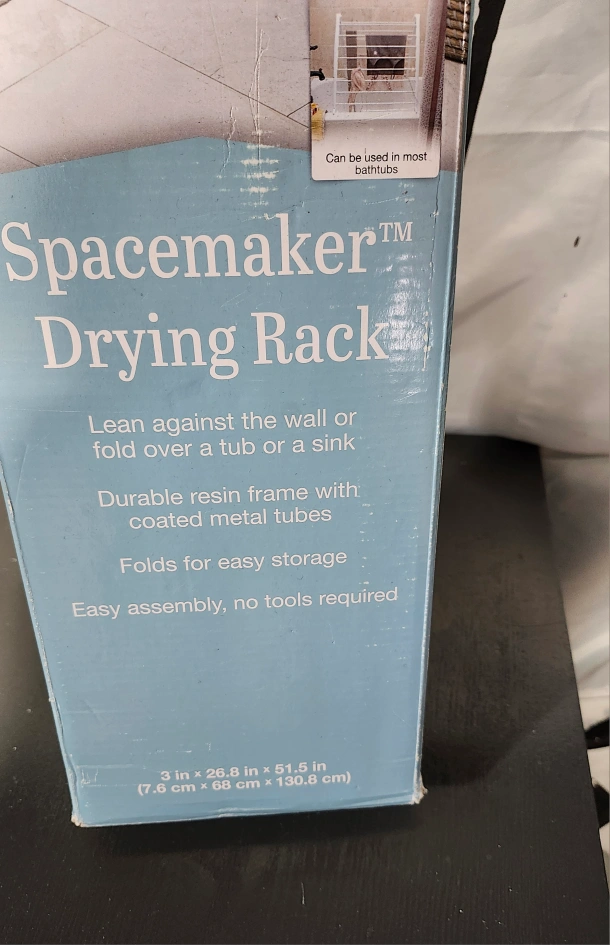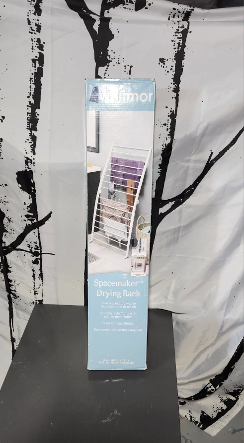 New in box. White space saving drying rack. Folds for easy storage. Durable coated metal frame. Lean against wall or fold over tub or sink. Easy assembly, no tools required.