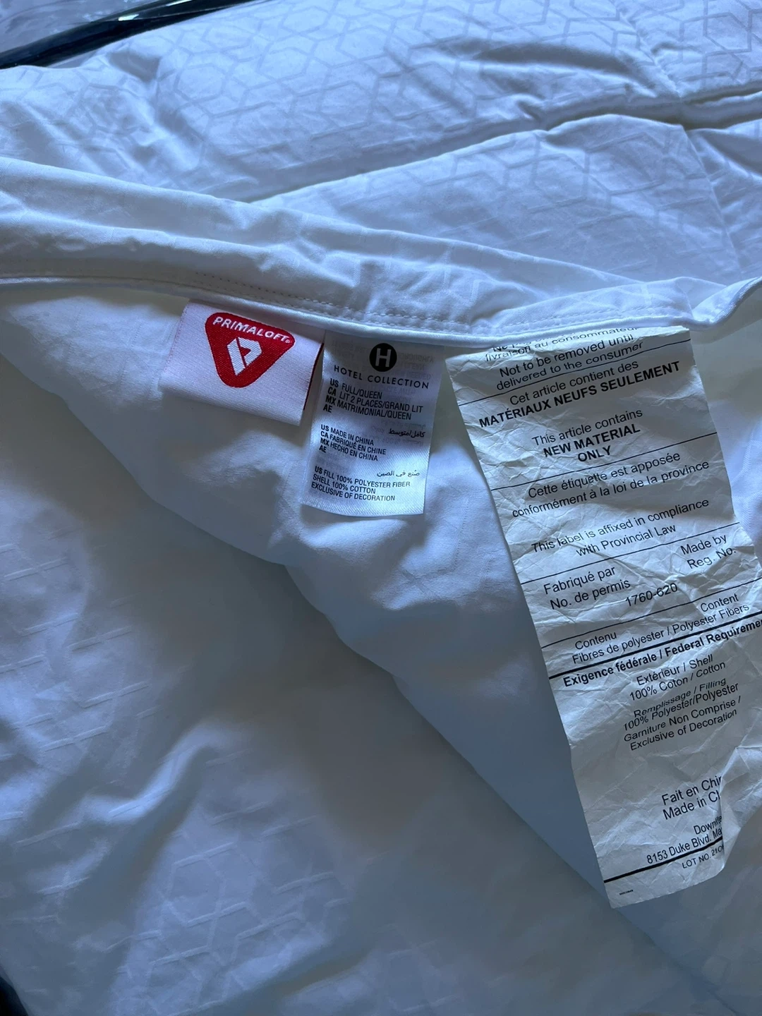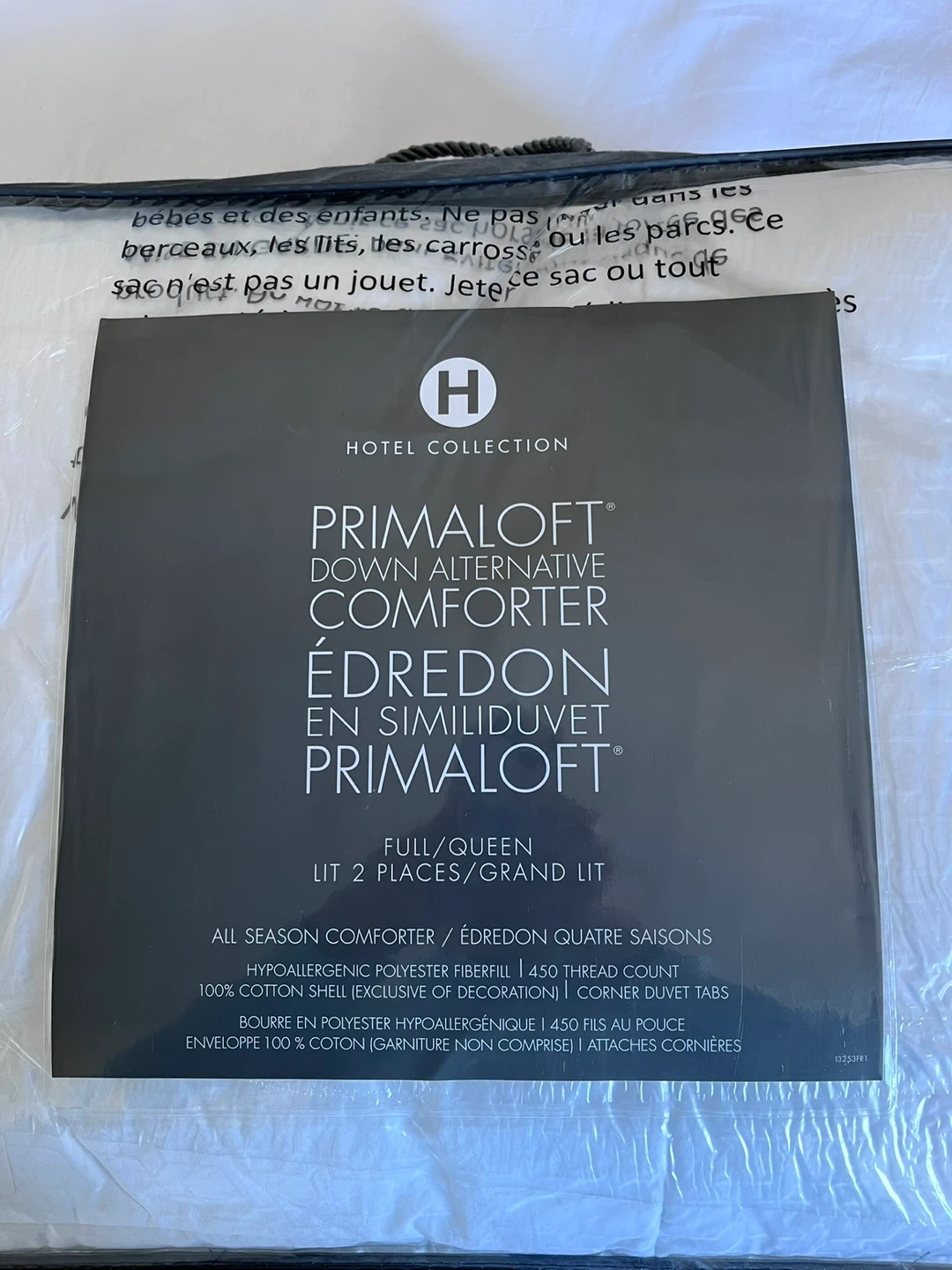 This Hotel Collection comforter uses Primaloft down alternative fill for extra warmth. It's a full/queen size, with a 450 thread count cotton shell. It was bough for the guest bedroom so, always used with its cover. No stains nor tears, it is in perfect condition. Even though it says all seasons I recommend it for the autumn and winter months as it is very warm.