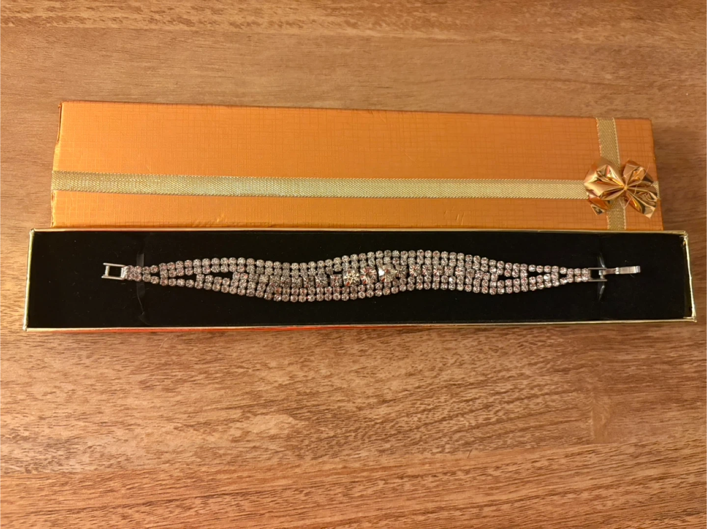 84Lovely bracelet. Features many small and large clear rhinestones. Secures with a clasp. You can slip it on your wrist and know you'll be feeling your best, effortlessly. White stones with box Feel free to also check my other listings make a bundle with discount. #HandmadeJewelry #MinimalJewelry #StatementJewelry #BohoJewelry #LuxuryJewelry #GoldJewelry #SilverJewelry #GemstoneJewelry #gift #bracelet